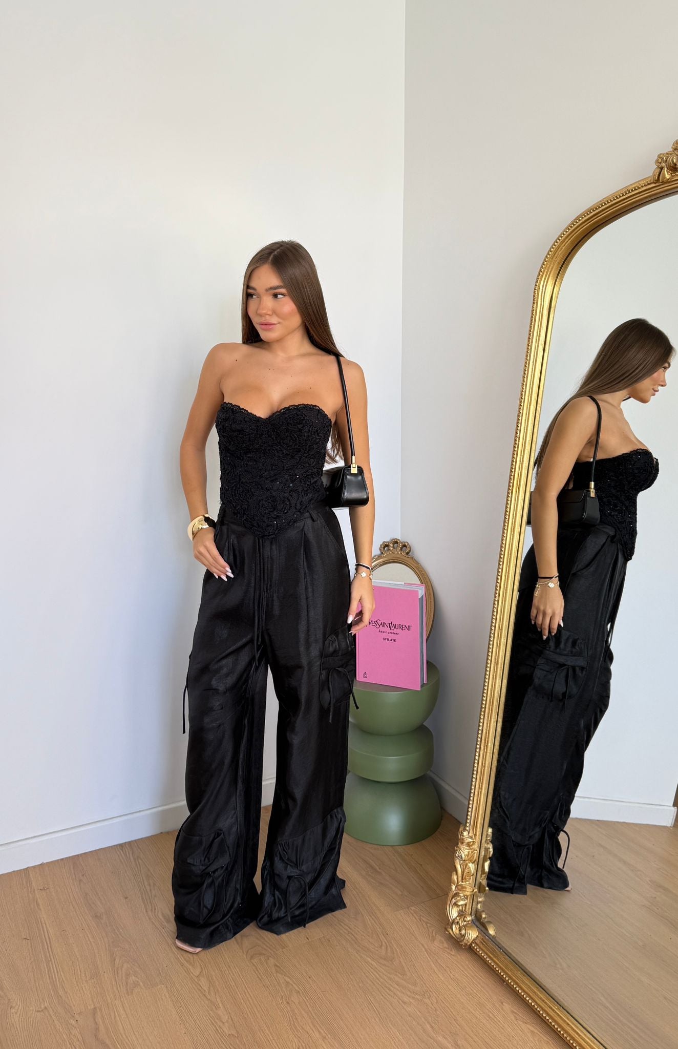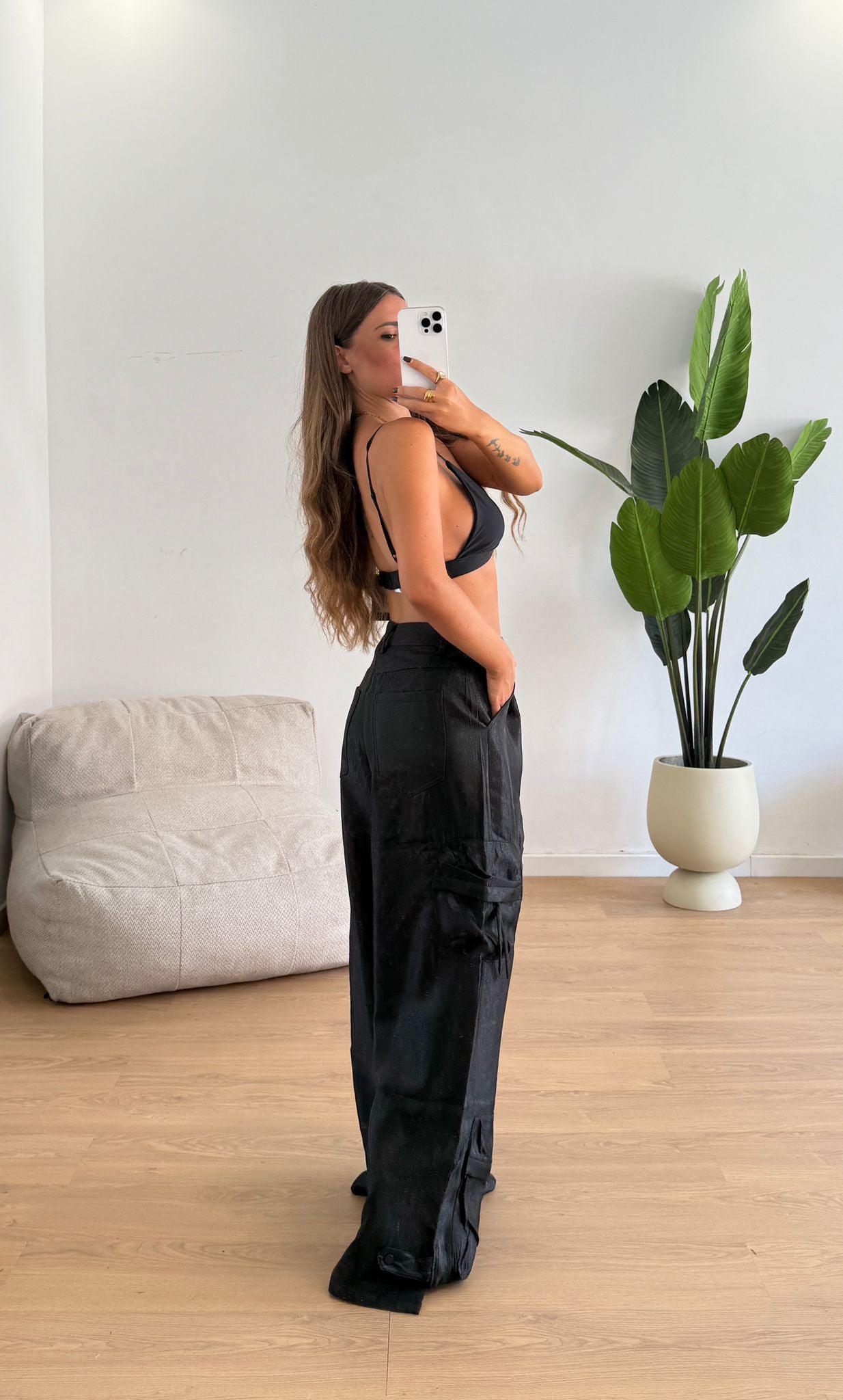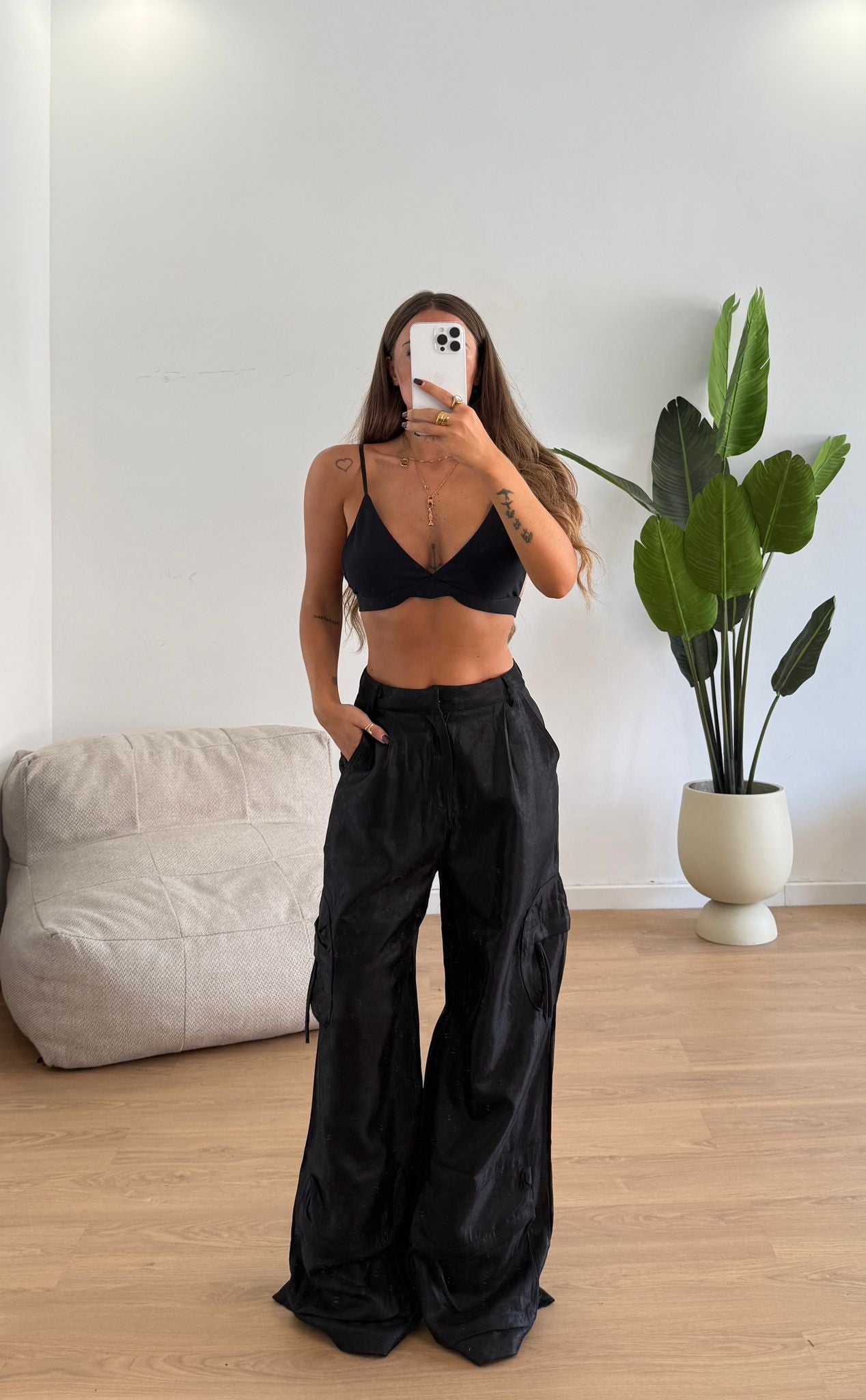 Pantalone effetto satinato, gamba larga, vestibilità regolare. Giusy in foto indossa una taglia S