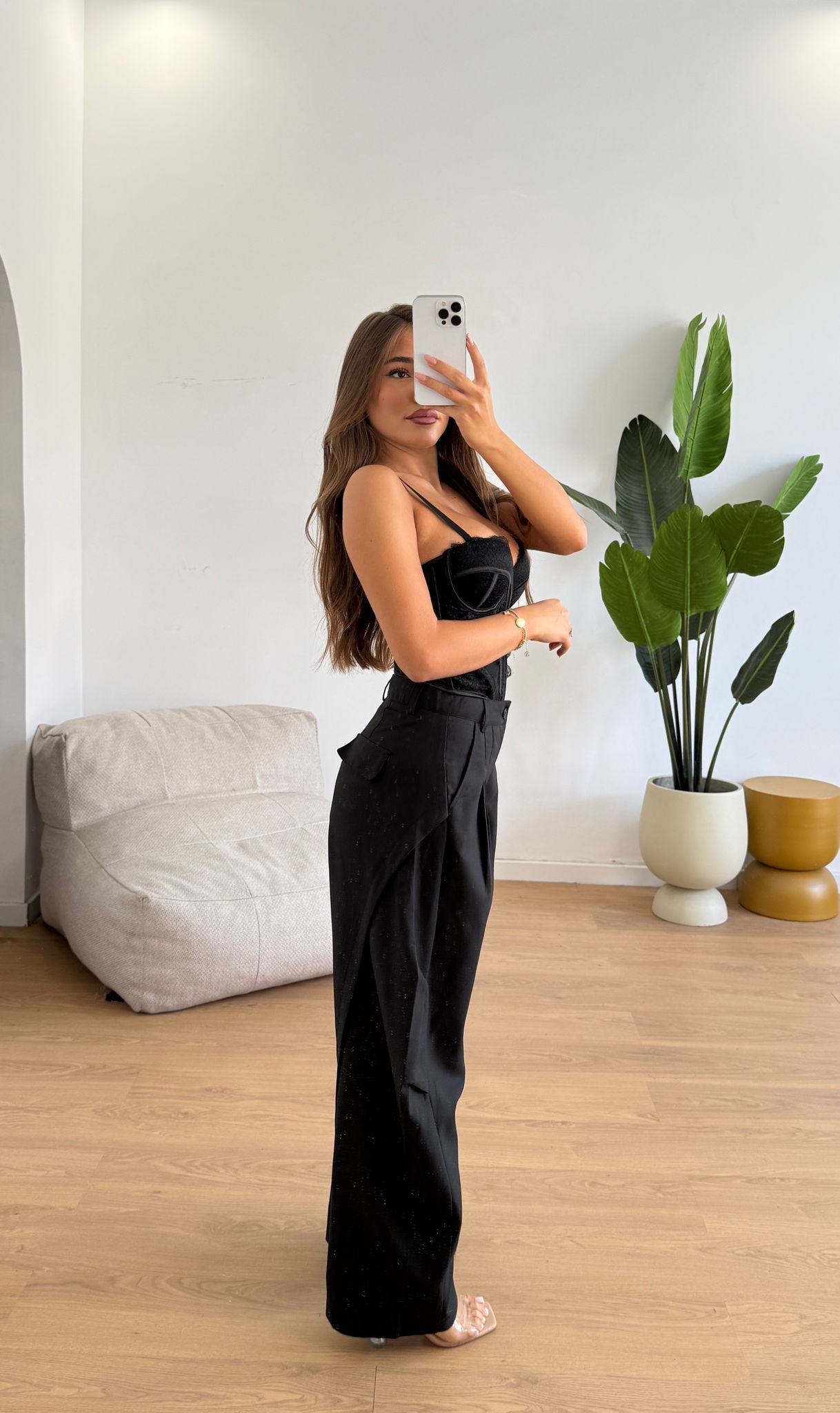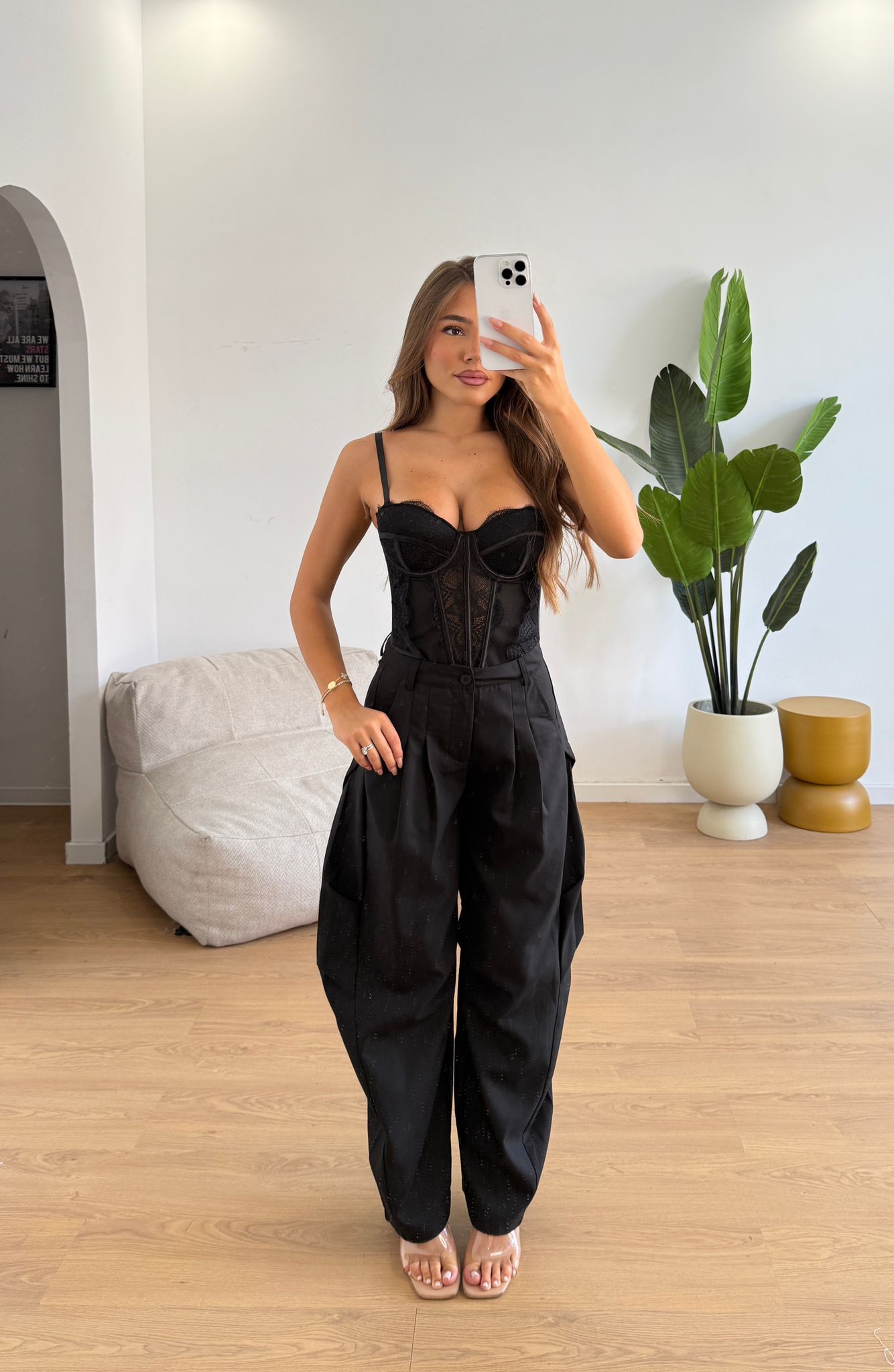 Pantalone da donna modello balloon fit e veste regolarmente la propria taglia, in foto indossa taglia S.