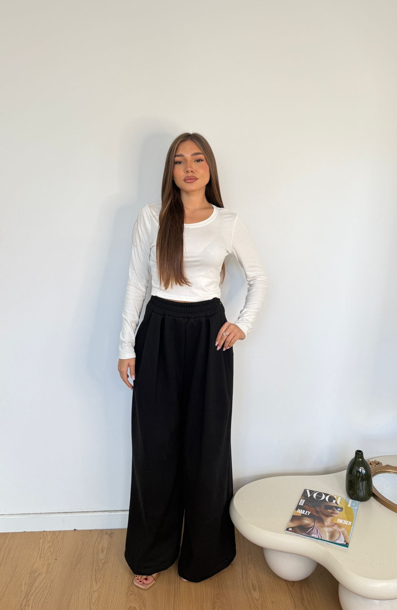 Pantatuta da donna con elastico in vita con laccio regolabile e veste bene la propria taglia, la modella indossa taglia S/M