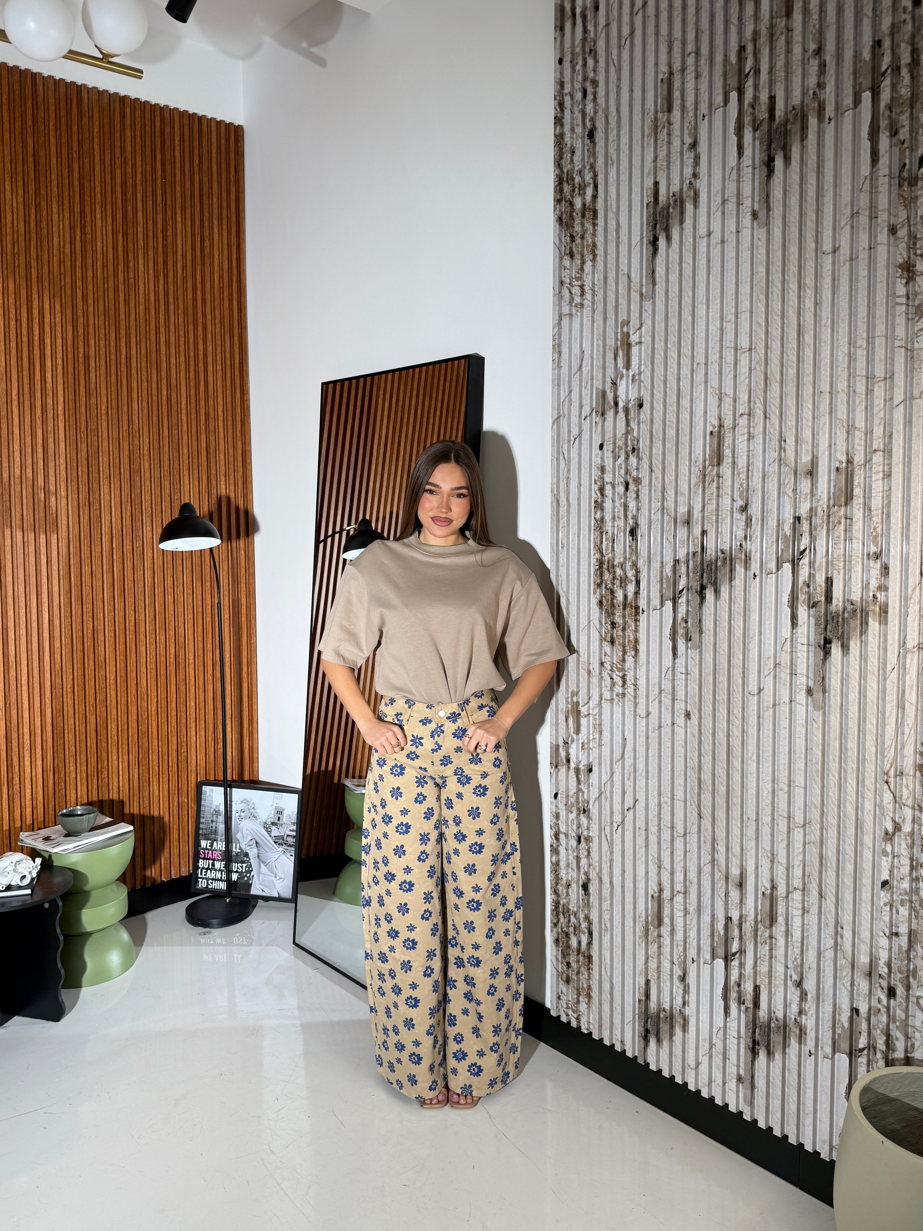 Jeans da donna a fantasia fiori modello a gamba larga con tasche, tessuto tela fissa non elasticizzato e veste bene la propria taglia. La modella indossa taglia S ed è alta 1,65 e pesa 52/53 KG.