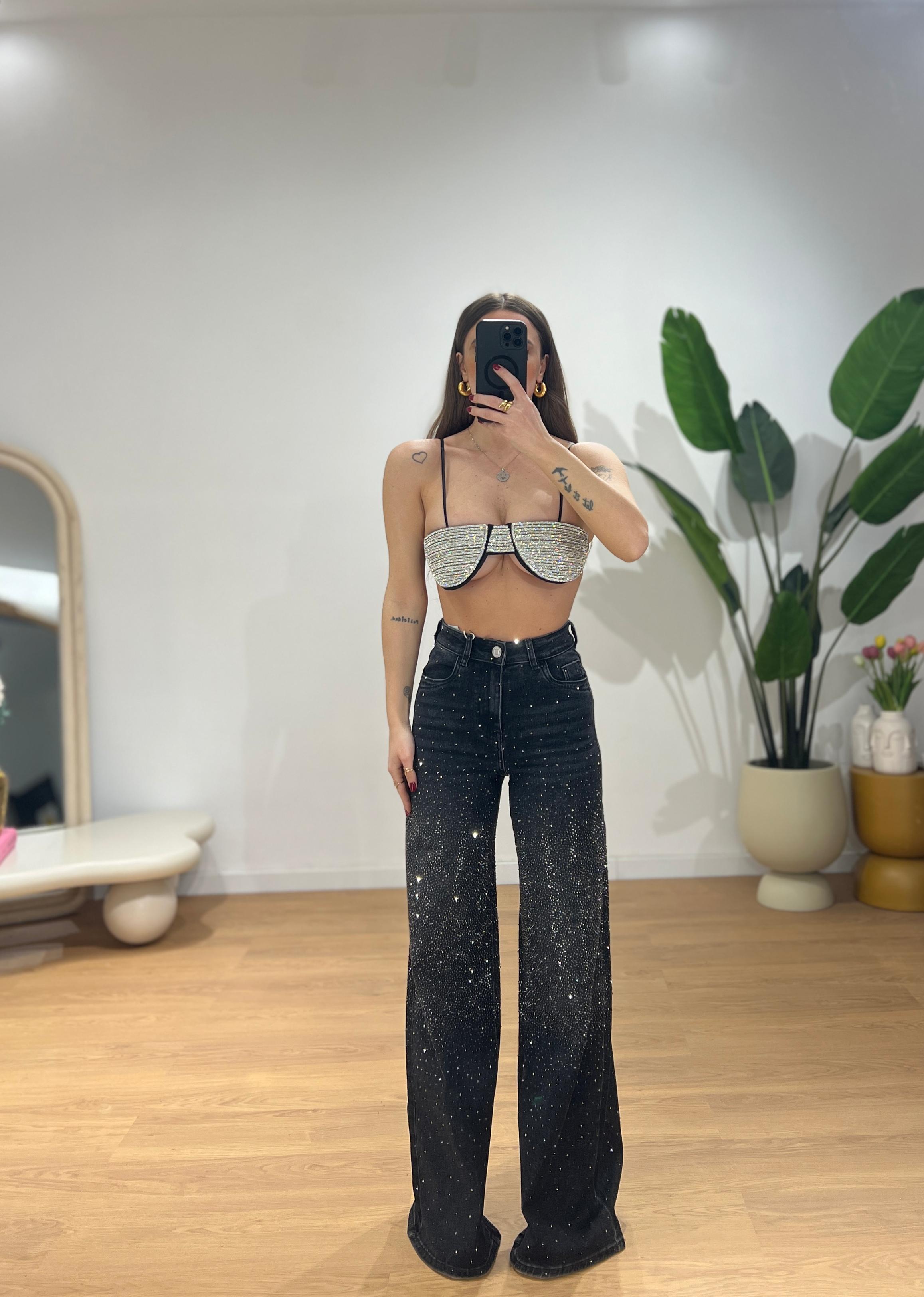 Bralette da donna con coppe imbottite, bretelle regolabili e attaccatura da reggiseno sul retro, ricoperte completamente sul davanti da strass. Veste regolarmente la propria taglia e Giusy indossa taglia S/M