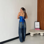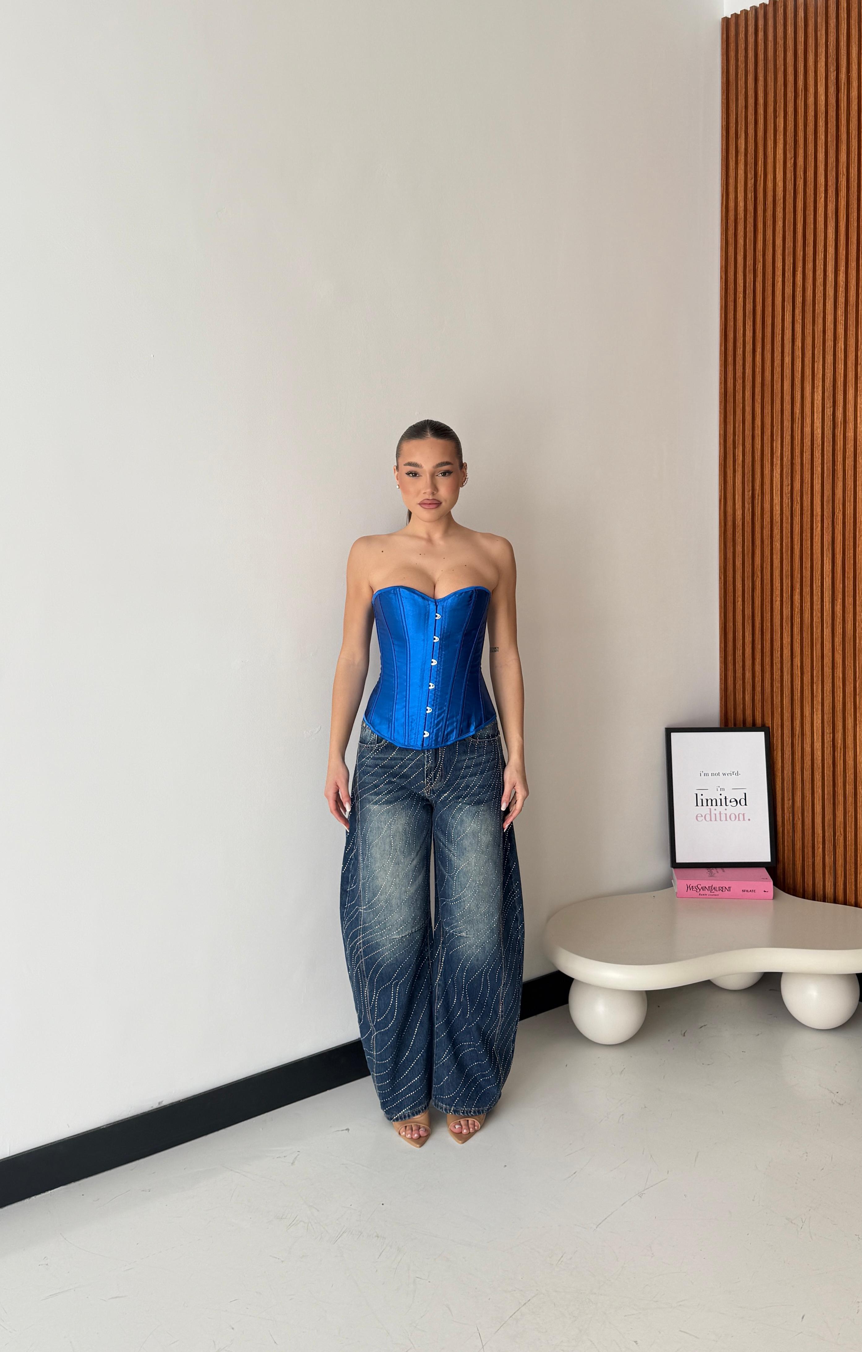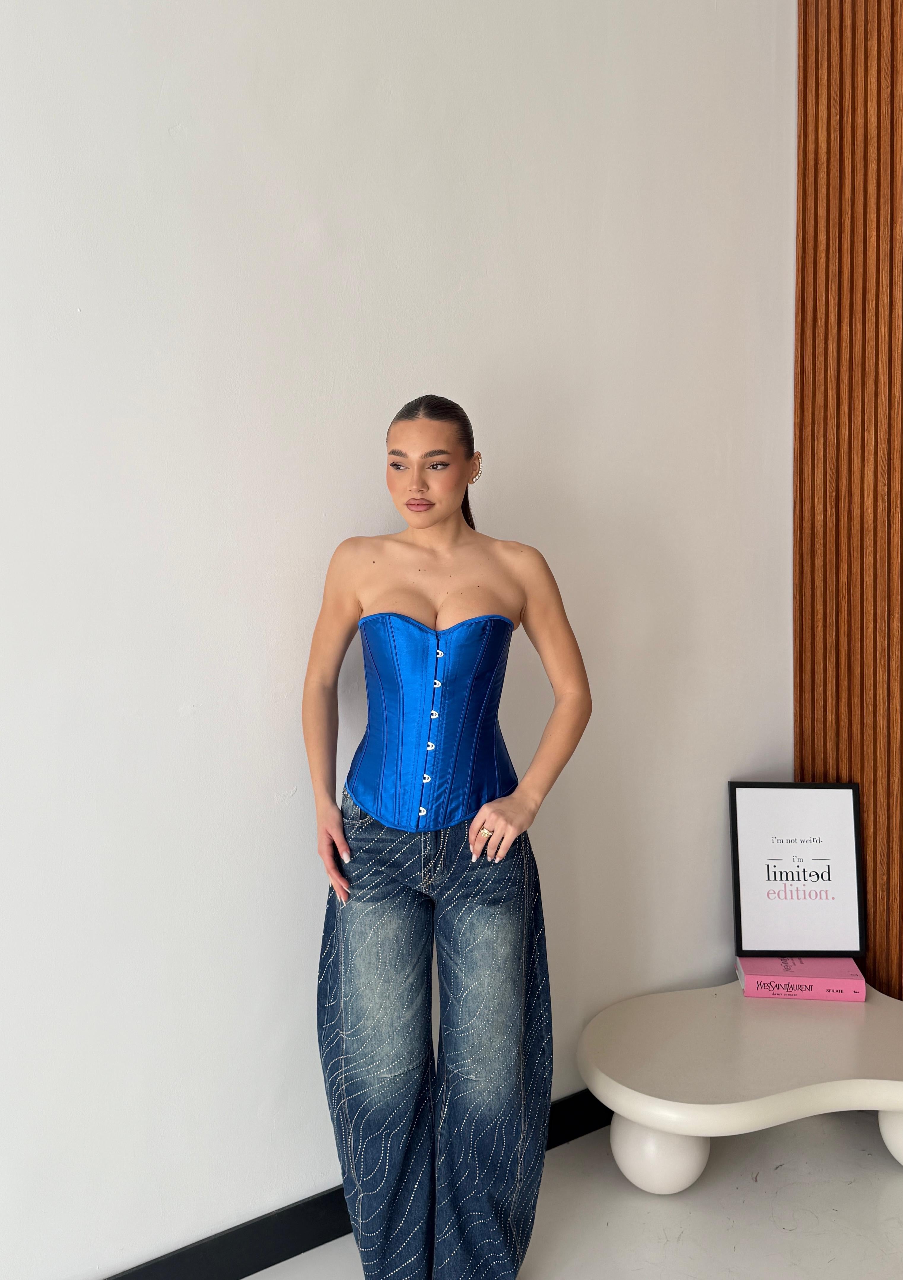 Bustino effetto raso con stecche e chiusura con ganci sul davanti, mentre sul retro chiusura regolabile ad intreccio con laccio. Vestirà bene fino ad una M/L e la modella è alta 1,65 cm, pesa 52/53 kg e porta una terza abbondante di seno.