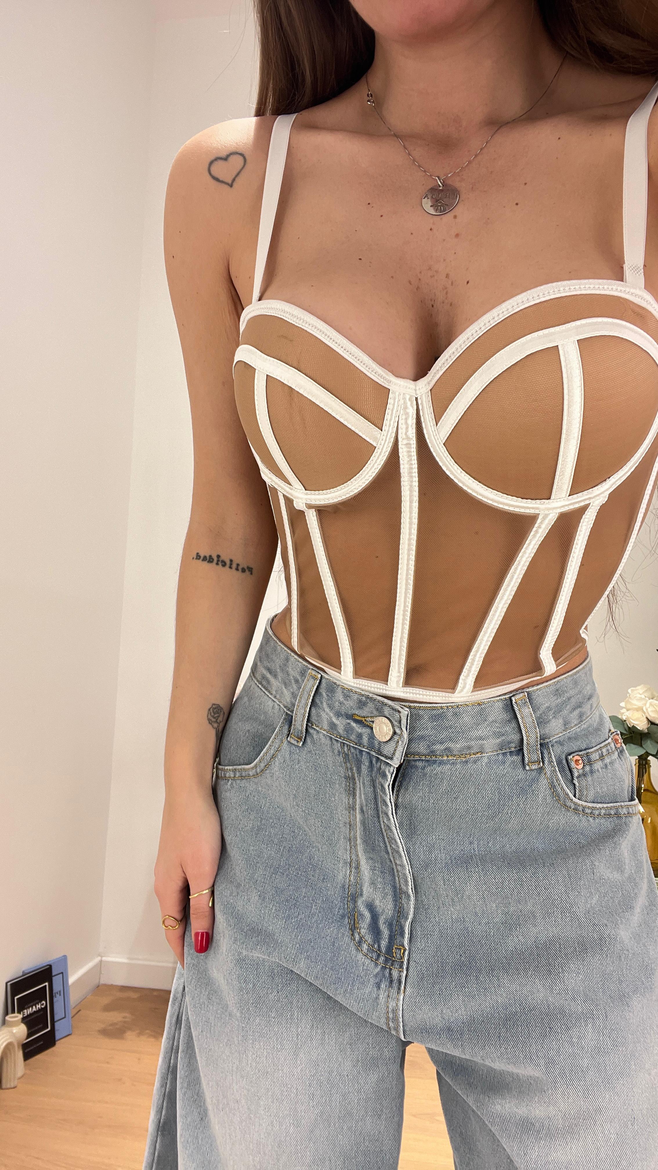 Corpetto da donna con coppe imbottite, ferretto e bretelle regolabili, attaccatura sul retro da reggiseno. Veste regolarmente la propria taglia e giusy indossa taglia S