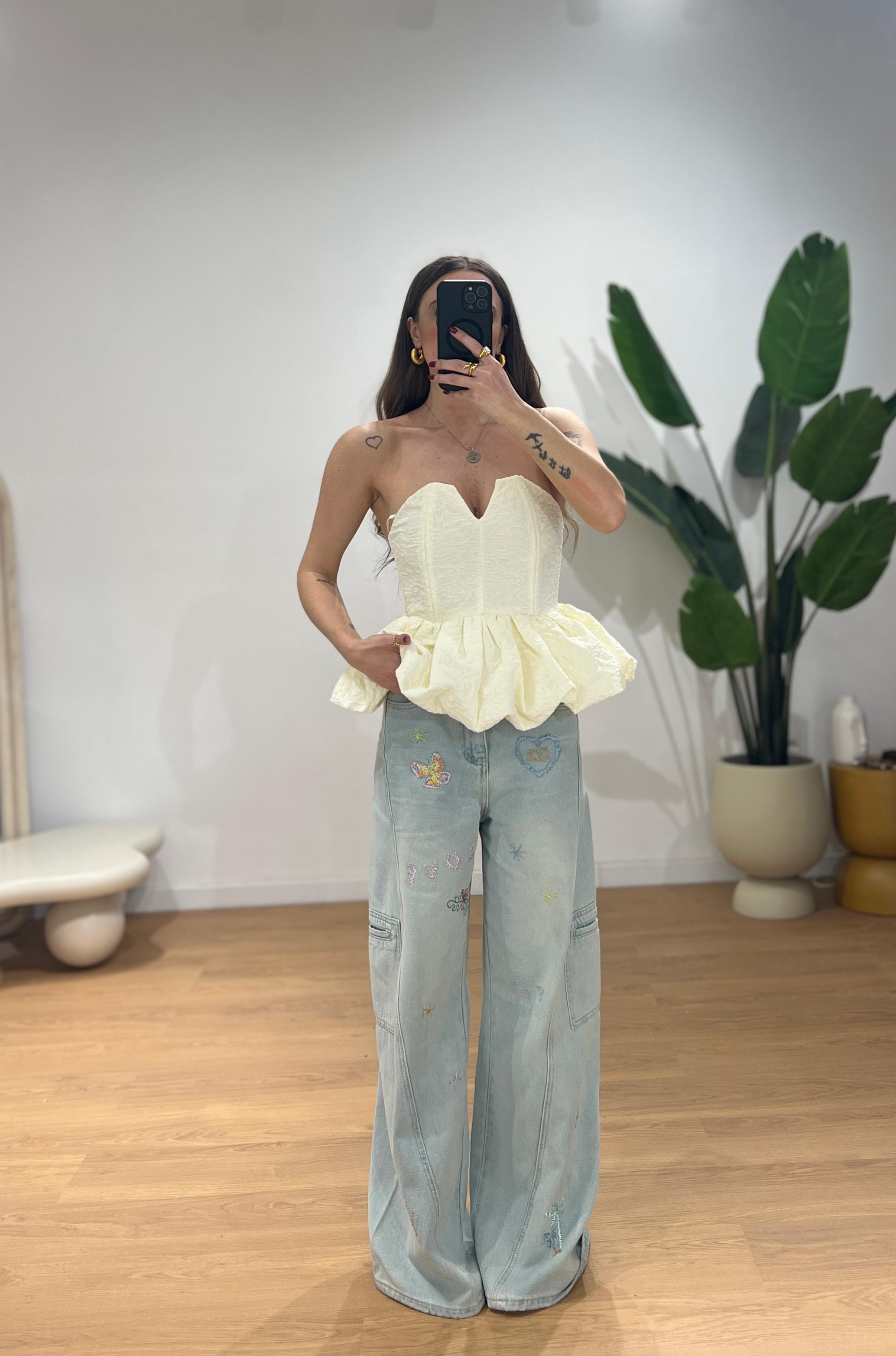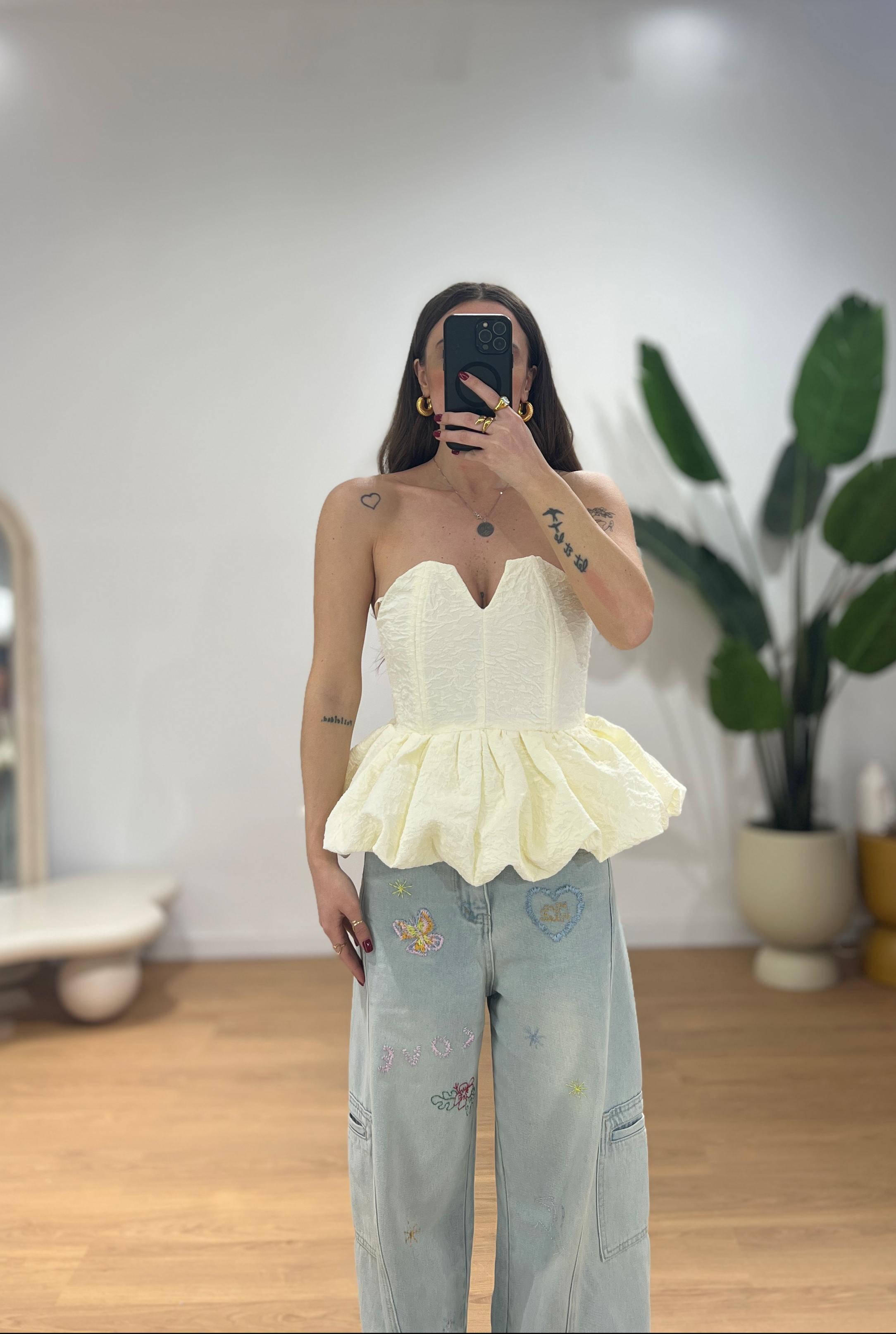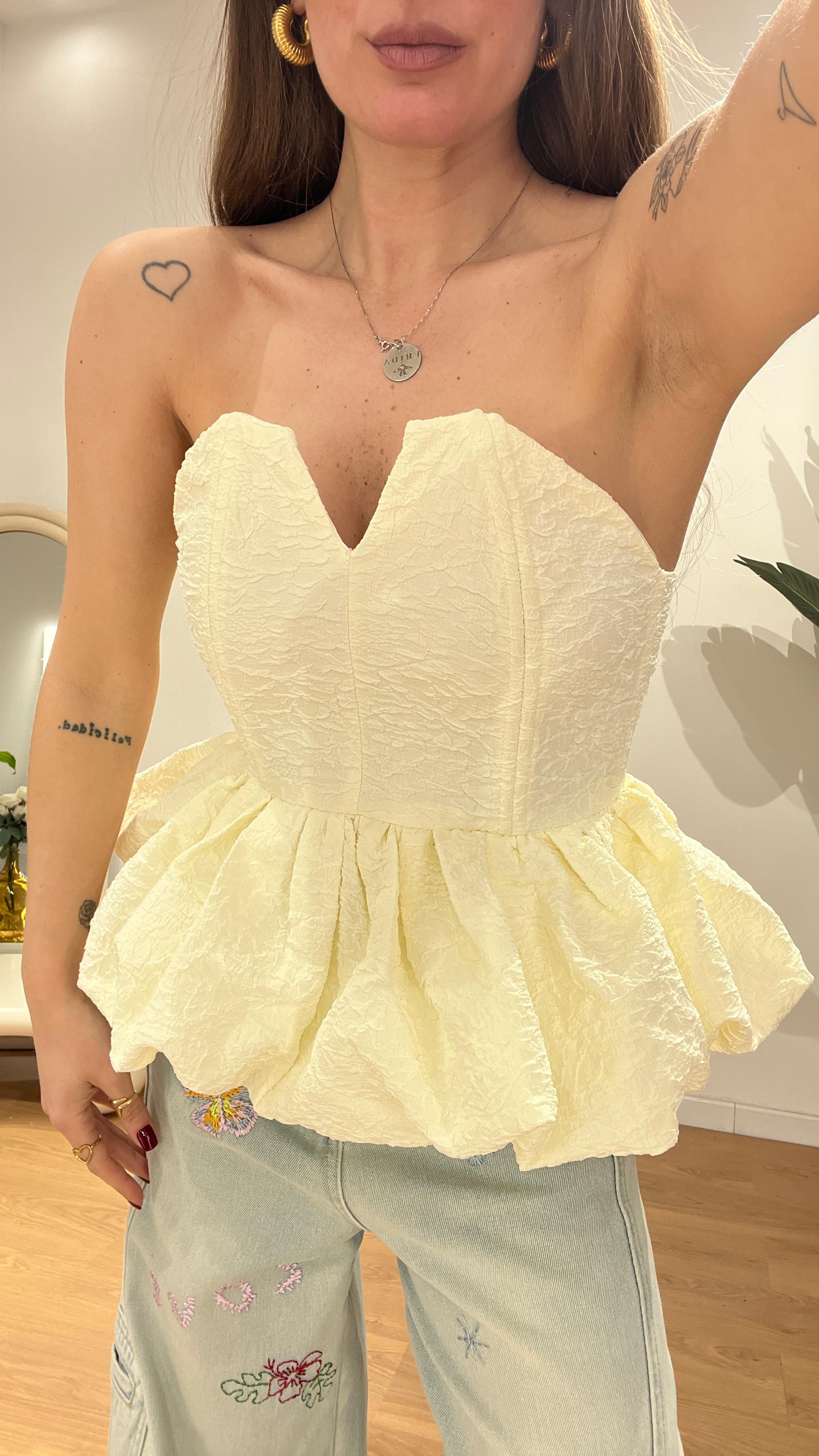 Corpetto a cuore senza spalline, con una scollatura strutturata e ferretti, termina sul fondo con un volant che aggiunge volume e movimento. Il tessuto dall'effetto stropicciato è leggermente elasticizzato. Sul retro presenta una chiusura con zip. Giusy indossa la taglia S.