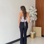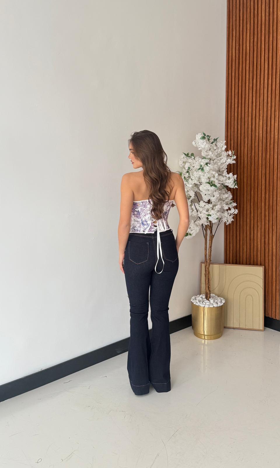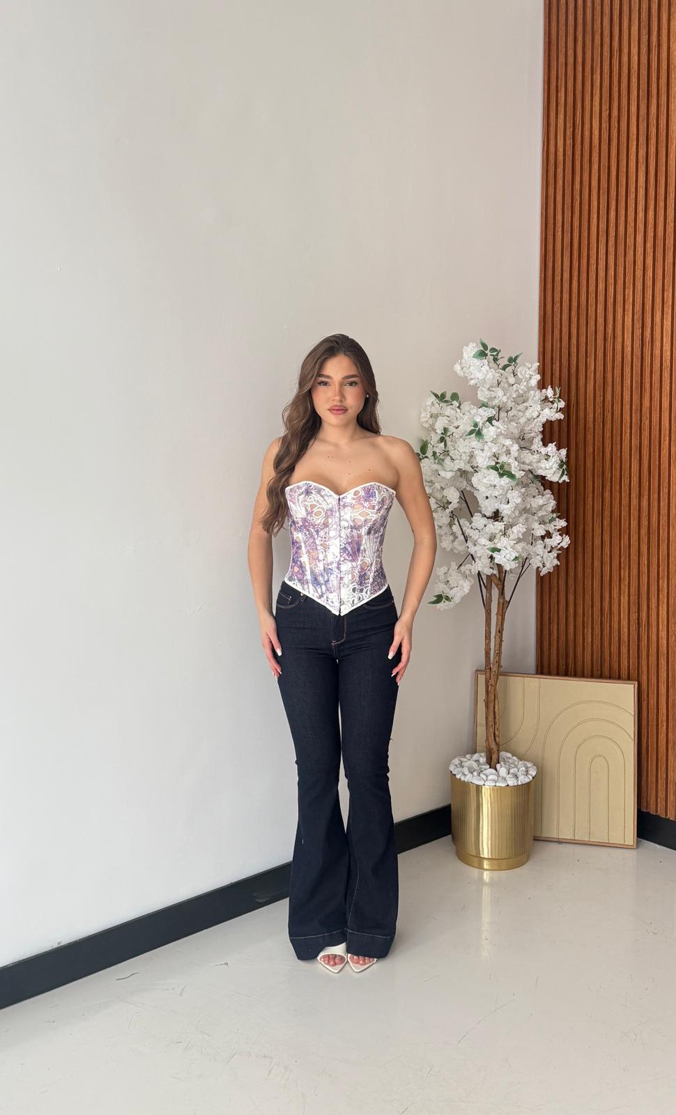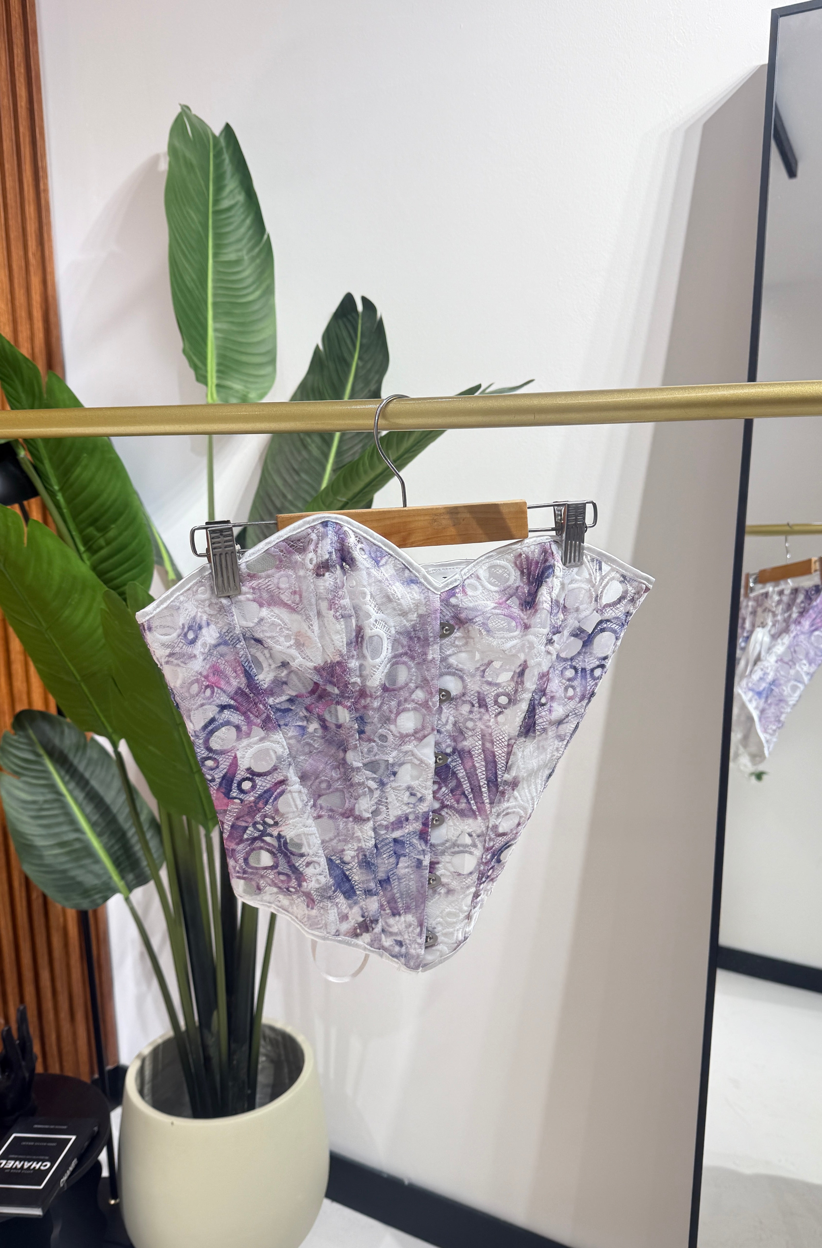 Bustino con coppa sfoderata, attaccatura sul davanti con gancetti e chiusura sul retro con laccetti regolabili. Taglia unica, veste bene fino ad una taglia M/L. La modella è alta 1,65 e pesa 52/53 kg.