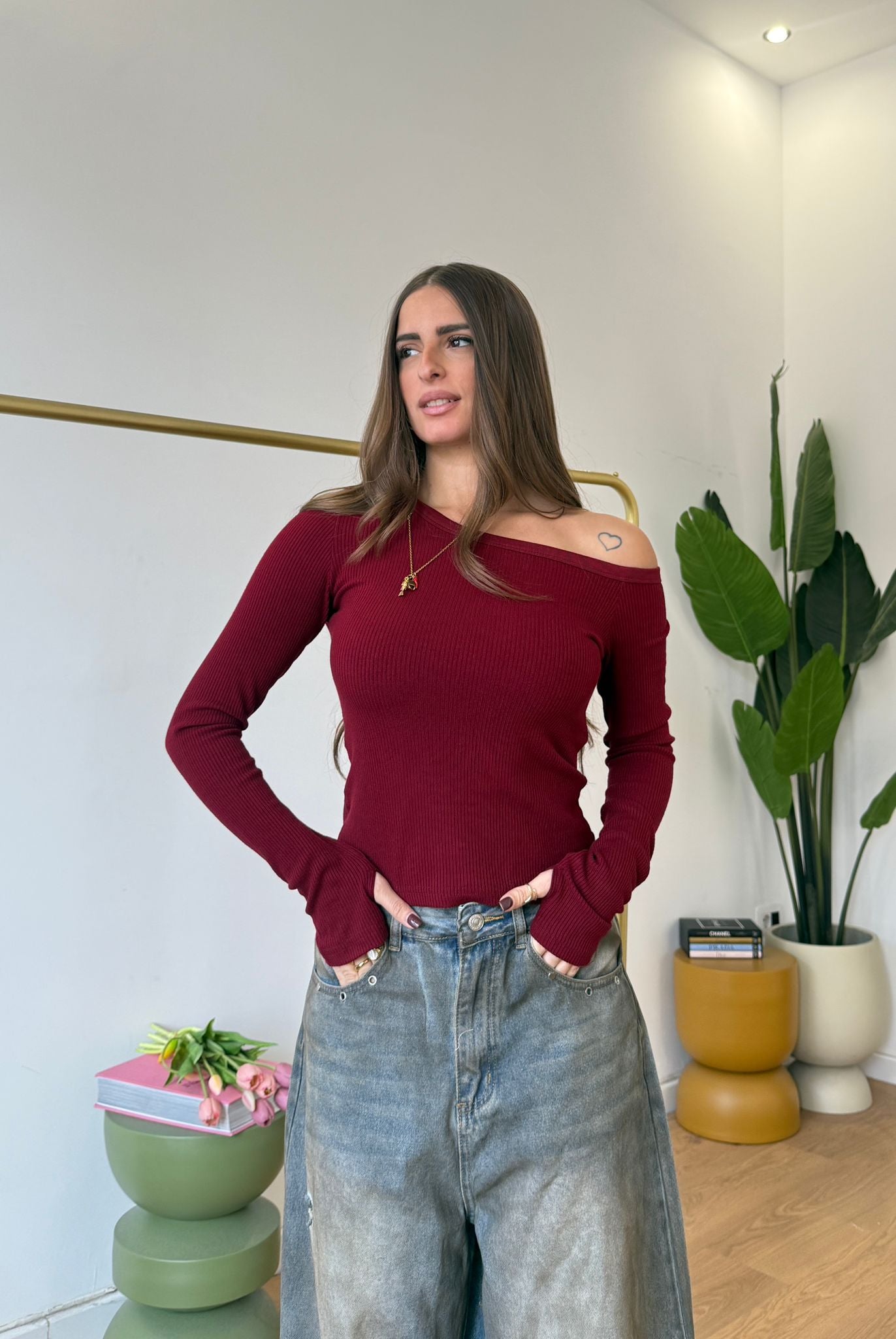Maglia da donna a costina tessuto elasticizzato e veste regolarmente la propria taglia e la modella indossa taglia S/M