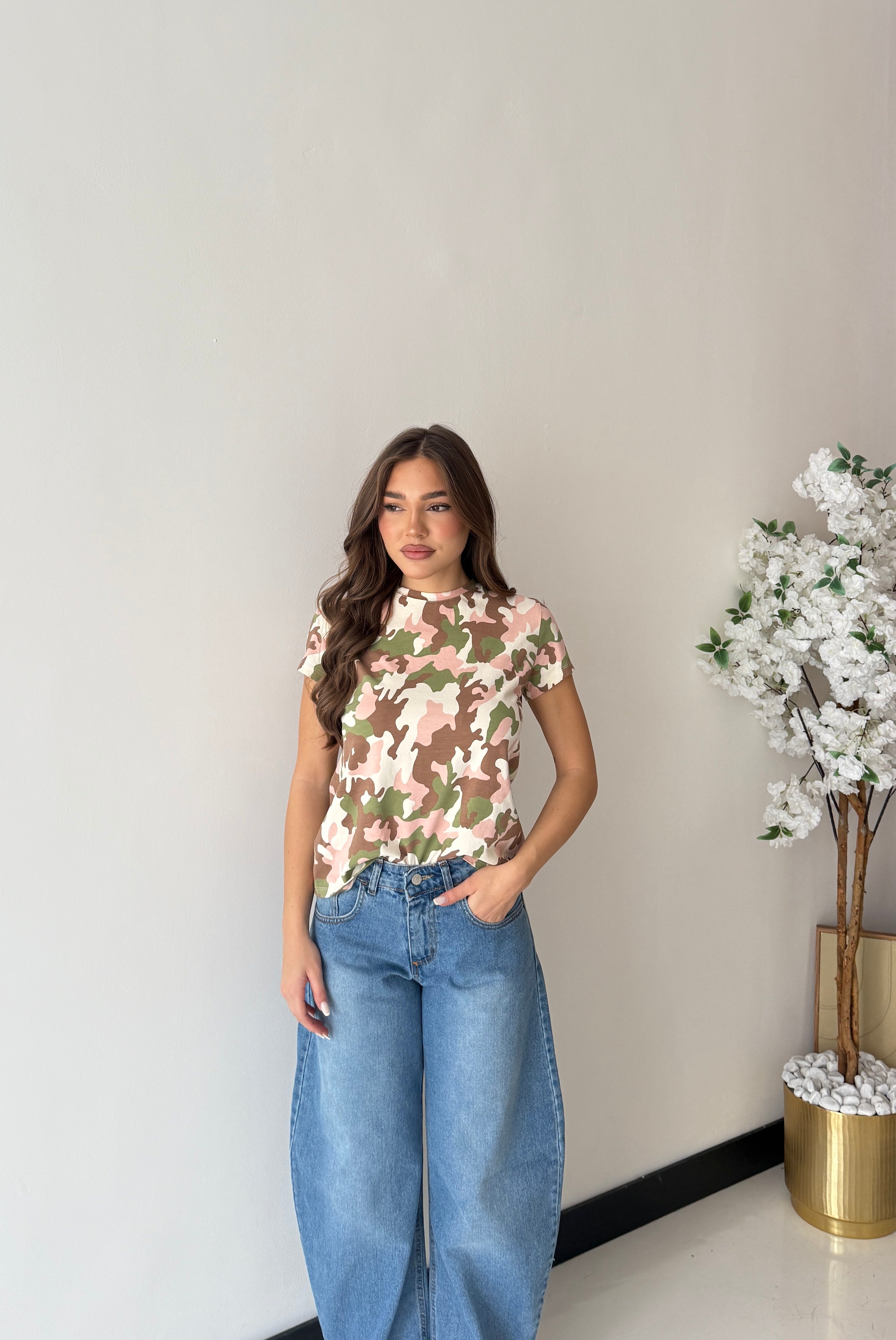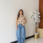 Shirt Lumina in cotone, girocollo. Taglia unica, tessuto elasticizzato, veste bene fino ad una taglia M/L. La modella è alta 1,65cm e pesa 52/53kg