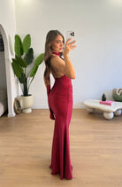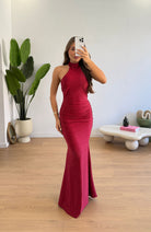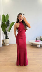 Abito da donna in lycra, tessuto elasticizzato. Composto da mezzo colletto con laccio regolabile, schiena scoperta e drappeggiato in vita. Taglia unica, veste bene fino ad una 44 piena.