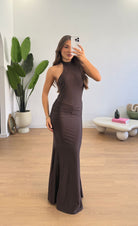 Abito da donna in lycra, tessuto elasticizzato. Composto da mezzo colletto con laccio regolabile, schiena scoperta e drappeggiato in vita. Taglia unica, veste bene fino ad una 44 piena.