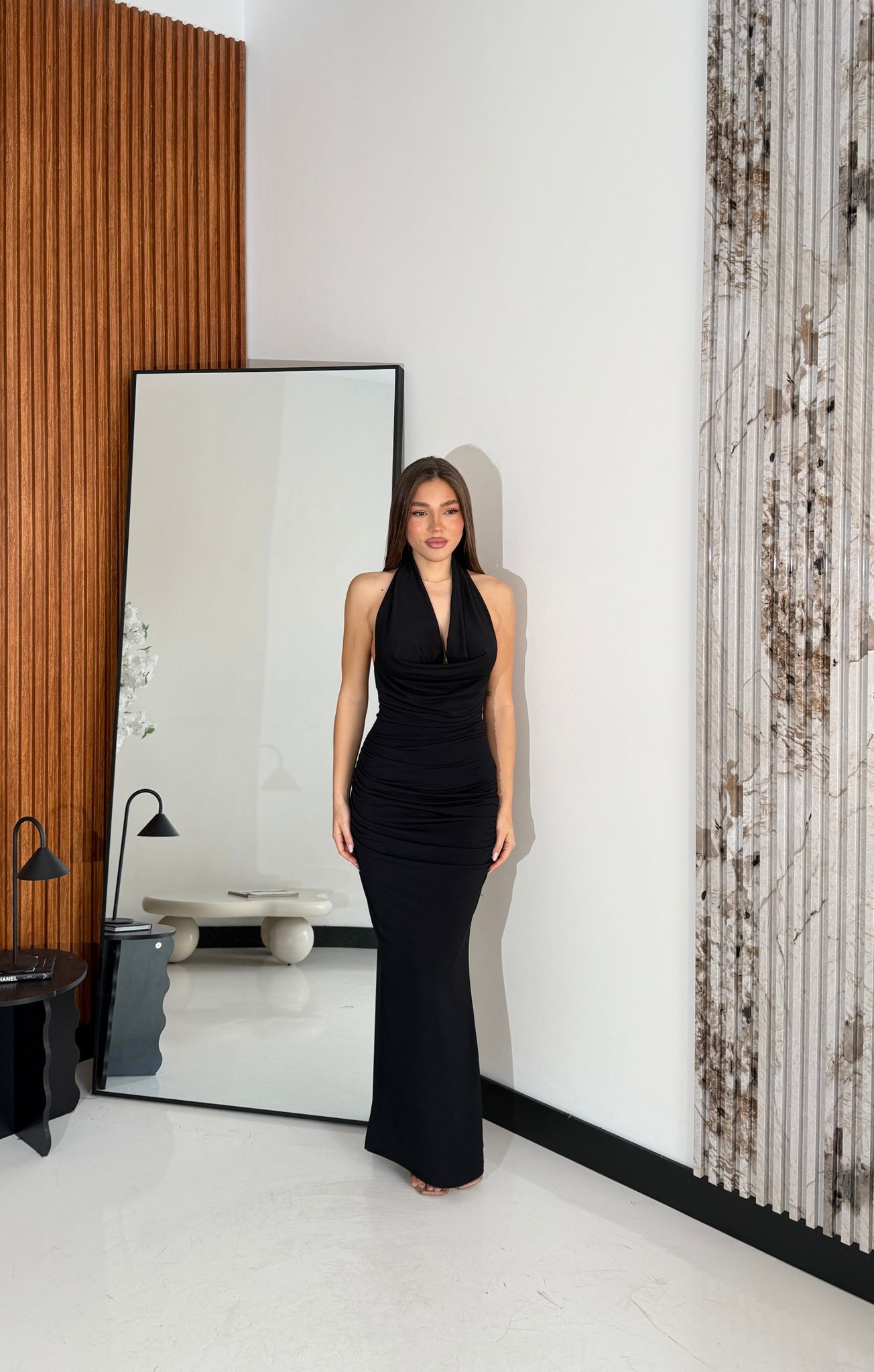 Abito con scollo profondo e morbido sul davanti con schiena scoperta e drappeggio sulla gonna, tessuto elasticizzato e vestirà bene fino ad una M/L e la modella è alta 1,65 cm e pesa 52/53 kg