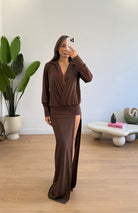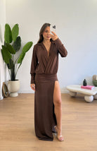 Abito da donna in lycra, tessuto elasticizzato. Con colletto, scollo profondo sul davanti e spacco laterale.Taglia unica, veste bene fino ad una 44 piena.