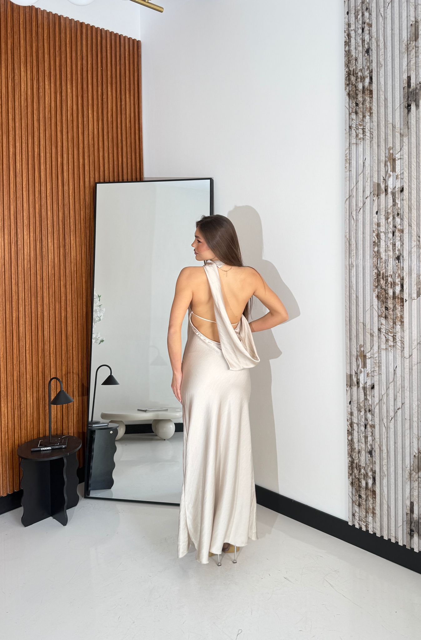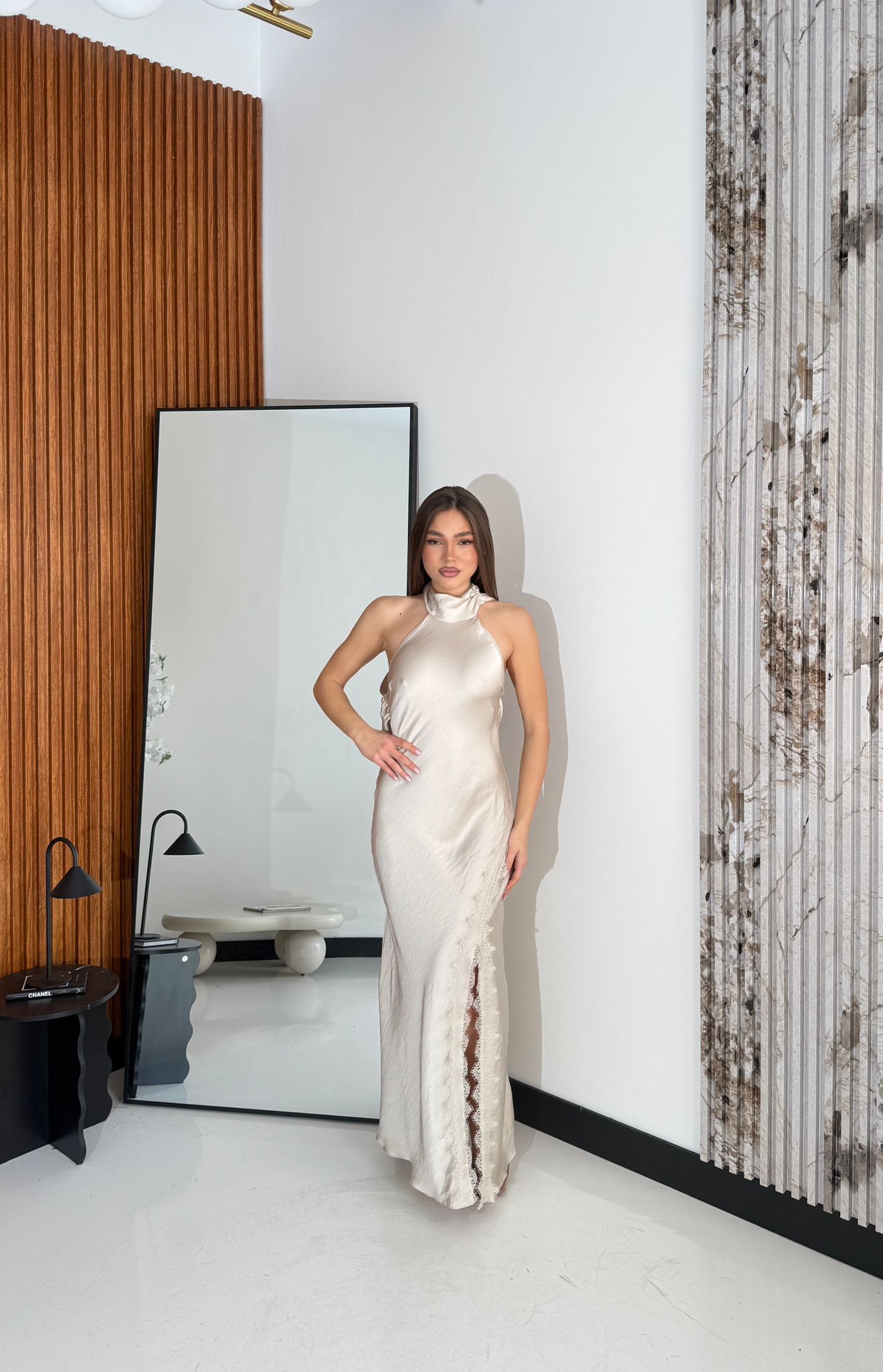 Abito effetto seta con schiena scoperta, attaccatura dietro al collo con bottoncini e con particolarità pizzo sul finale con spacco laterale, vestirà bene fino ad una M/L e la modella è alta 1,65 cm e pesa 52/53 kg