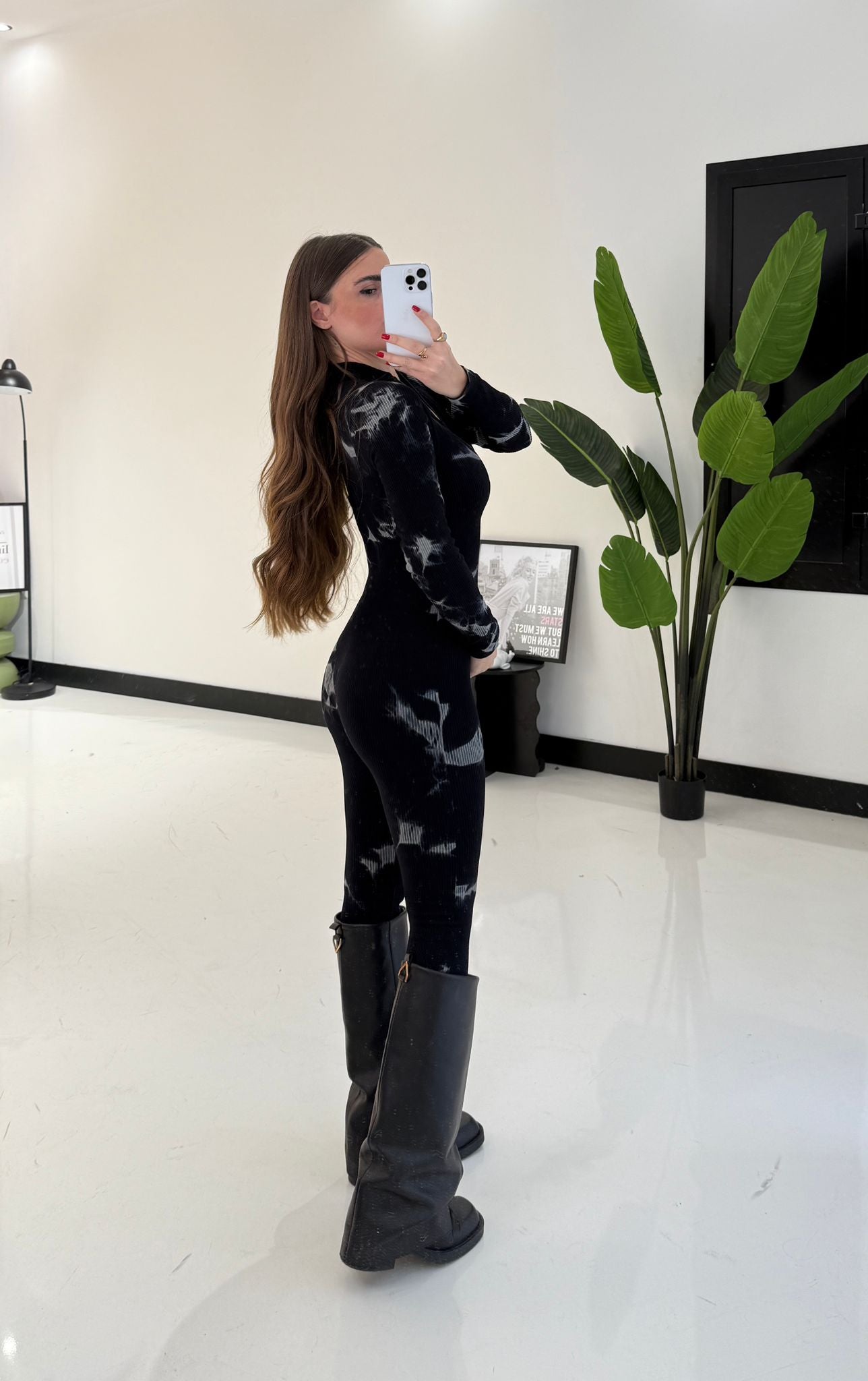 Tuta da donna low-cost a costine, tessuto elasticizzato a fantasia con zip sul davanti e veste regolarmente la propria taglia. La modella indossa taglia S/M; È alta 1,65 e pesa 52/53 KG