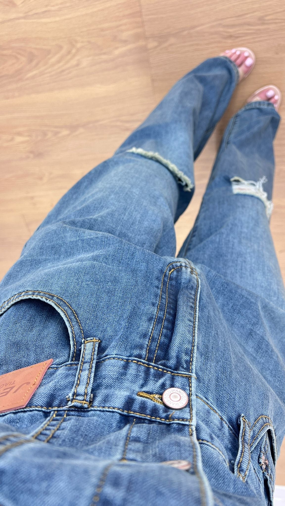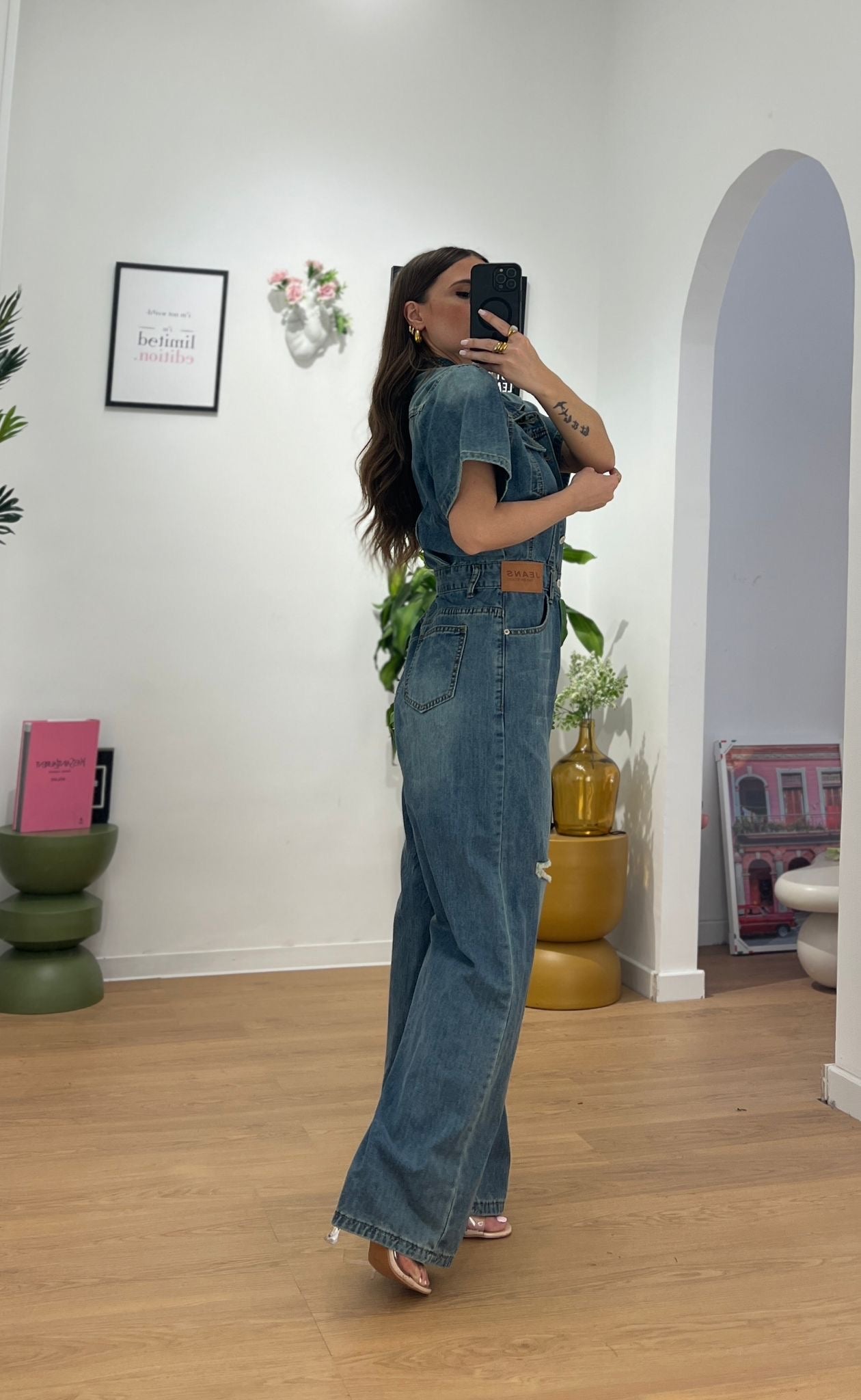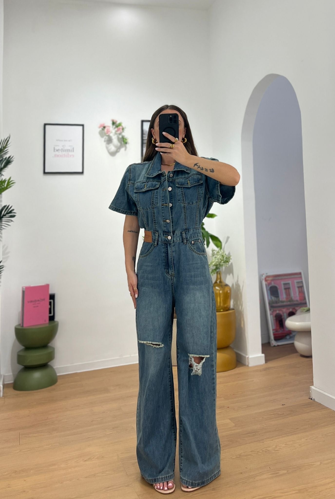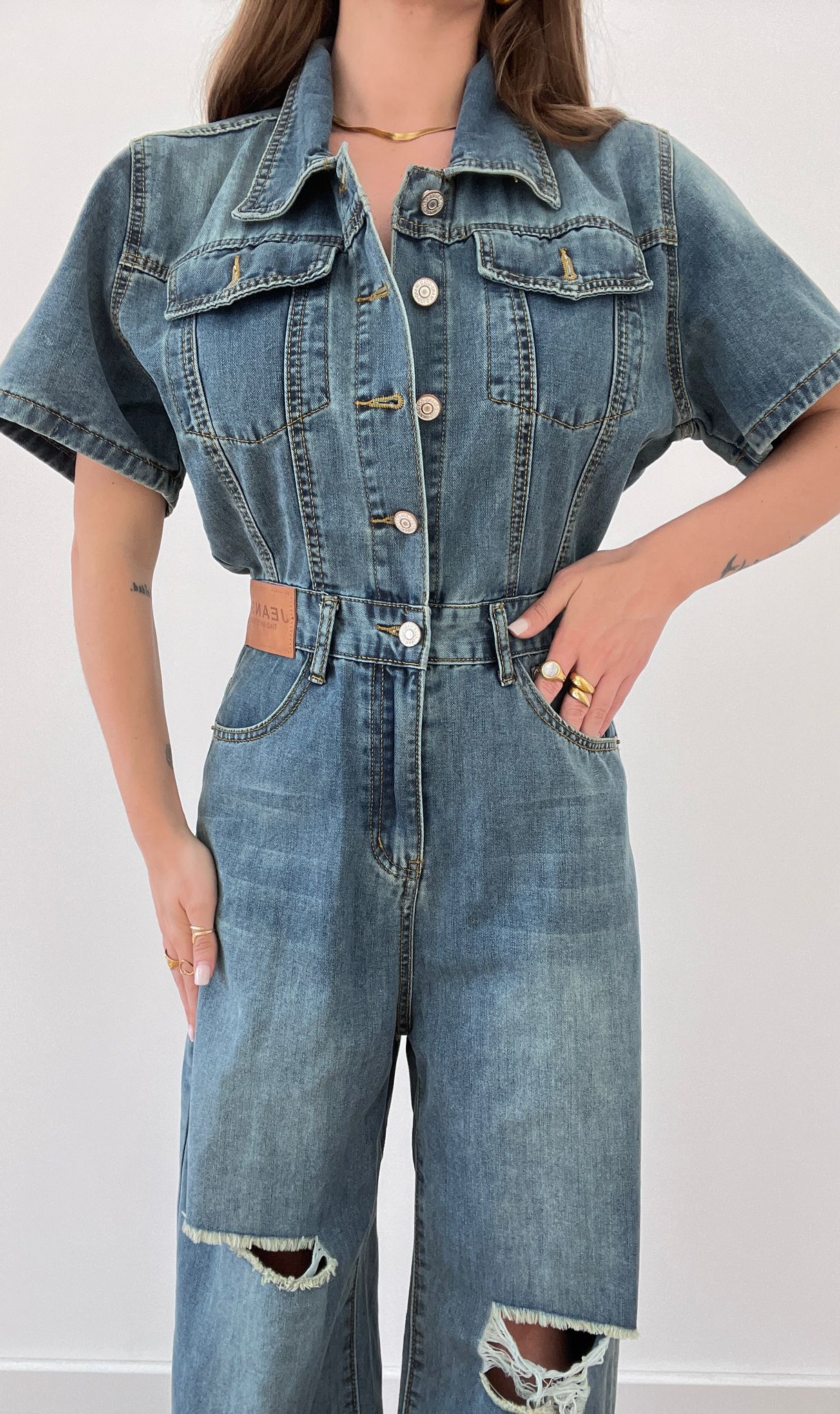 Tuta in denim leggero, mezza manica con taschini sul davanti. Presenta una chiusura con bottoni e zip. Pantalone modello wide leg, con strappi sulle ginocchia. Giusy indossa taglia S/M.