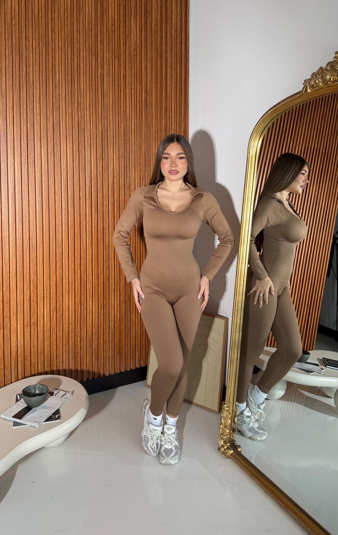 Tuta da donna a costine con colletto a camicia, tessuto elasticizzato con effetto push-up sul retro. La tuta vestirà bene fino ad una M/L e la modella è alta 1,65 e pesa 52/53 kG