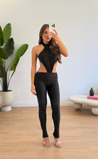 Tuta da donna in lycra, tessuto elasticizzato. Composta da mezzo colletto e schiena scoperta. Taglia unica, veste bene fino ad taglia M.