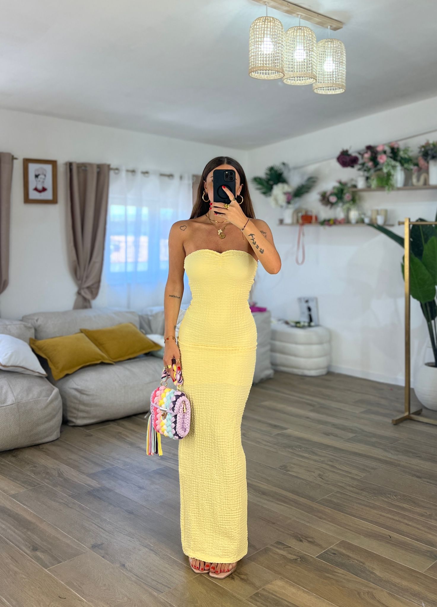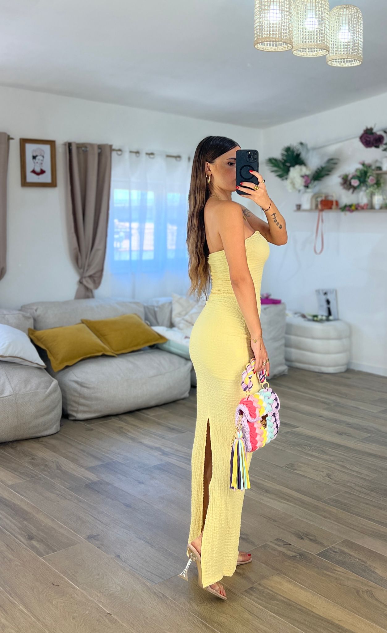 L'abito Kandy è perfetto per le donne moderne ed eleganti. Realizzato con materiale elasticizzato, si adatta perfettamente al corpo, offrendo comfort e libertà di movimento. Lo spacco sul retro aggiunge un tocco di sensualità senza compromettere la classe e l'eleganza dell'abito. Perfetto per ogni occasione.