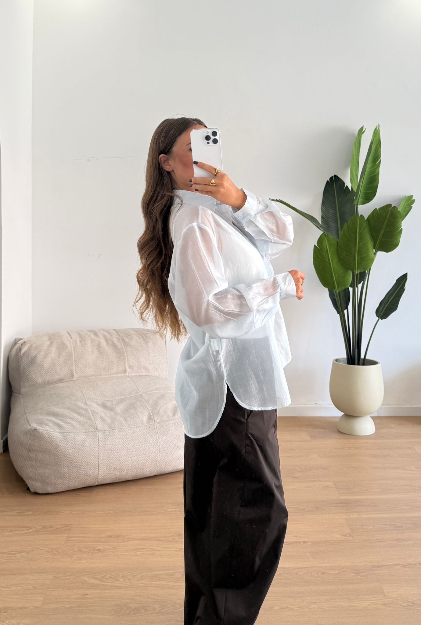 Camicia semitrasparente, tessuto leggero, vestibilità over, veste regolarmente la propria taglia.