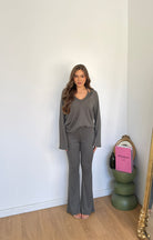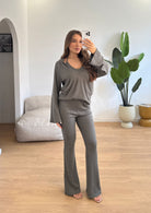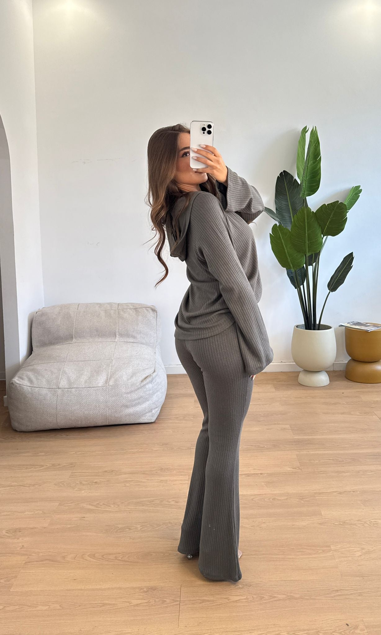Coordinato da donna a costine composto da felpa con cappuccio, canotta e pantalone con elastico in vita. Taglia unica, veste bene fino ad una M/L.