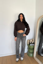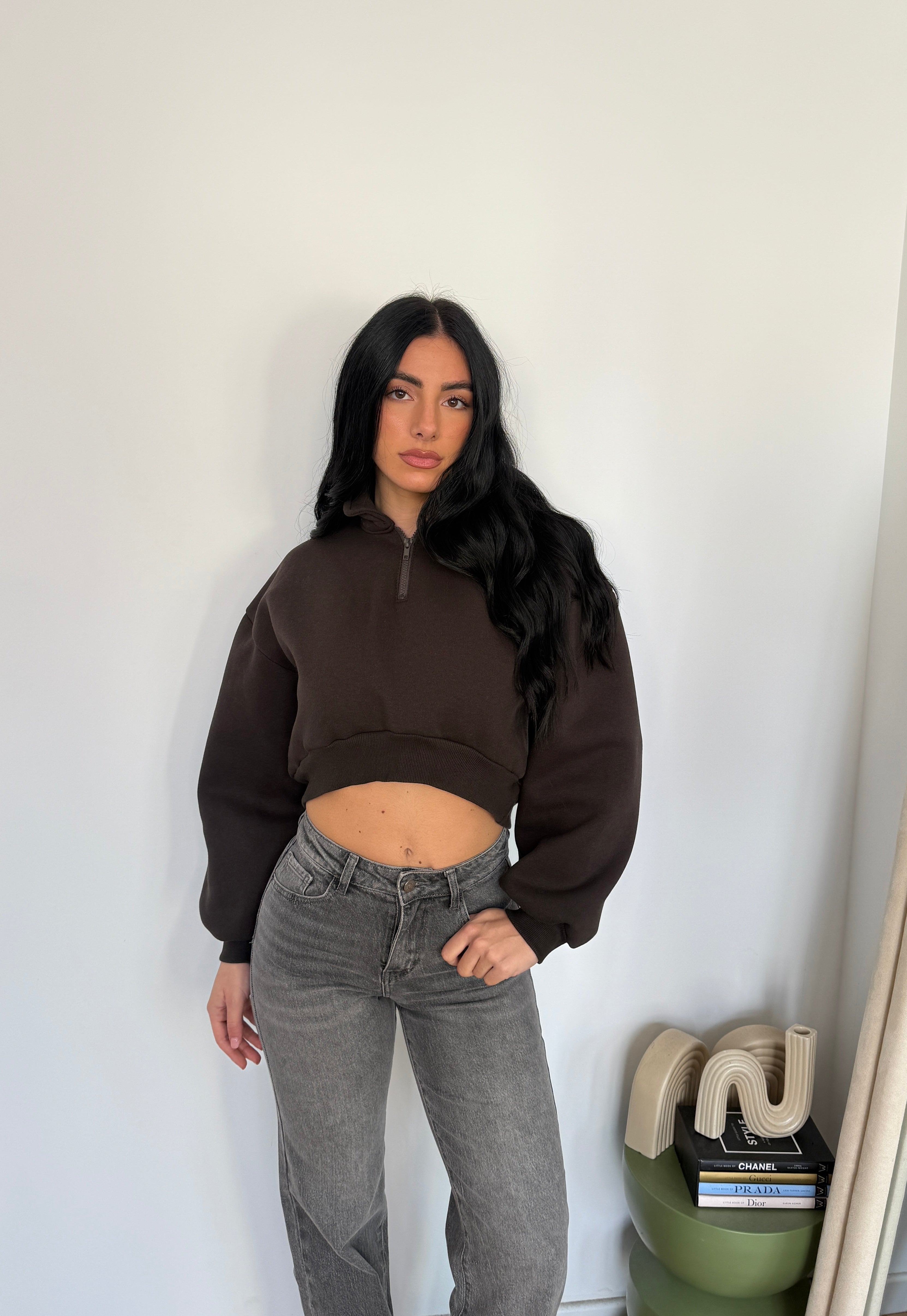 Felpa da donna crop felpata internamente con polsini, elastico in vita e cerniera sullo scollo. Taglia unica, veste  bene fino ad una M piena.
