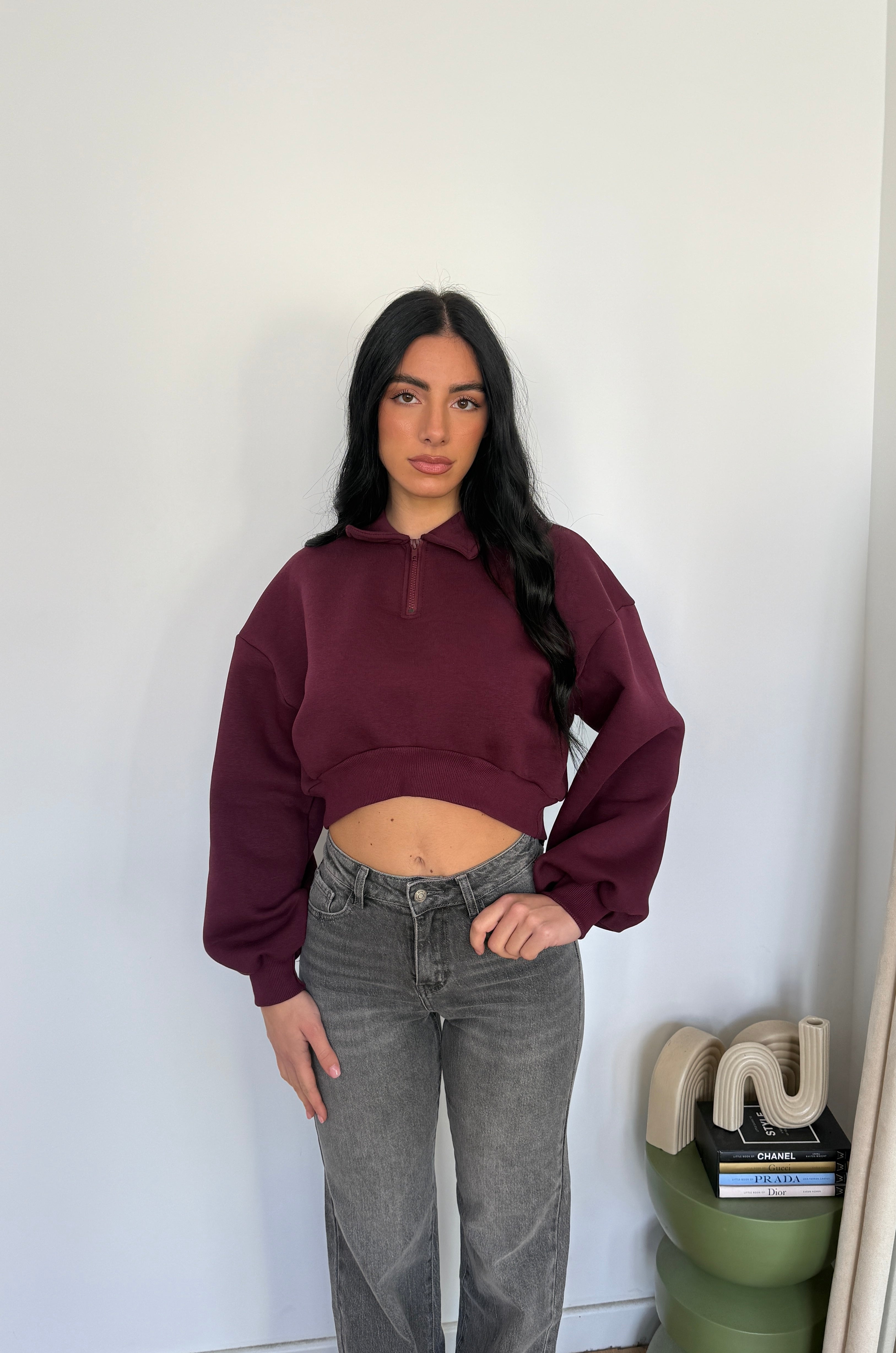 Felpa da donna crop felpata internamente con polsini, elastico in vita e cerniera sullo scollo. Taglia unica, veste  bene fino ad una M piena.