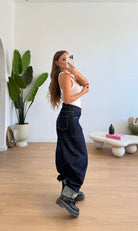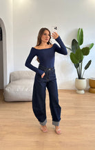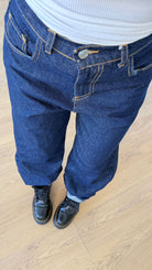 Jeans da donna in denim tela fissa modello ballon ma veste regolarmente la propria taglia e la modella indossa taglia XS