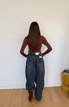 Jeans da donna in tela fissa, modello baggy carpenter e veste regolarmente la propria taglia, la modella indossa taglia XS