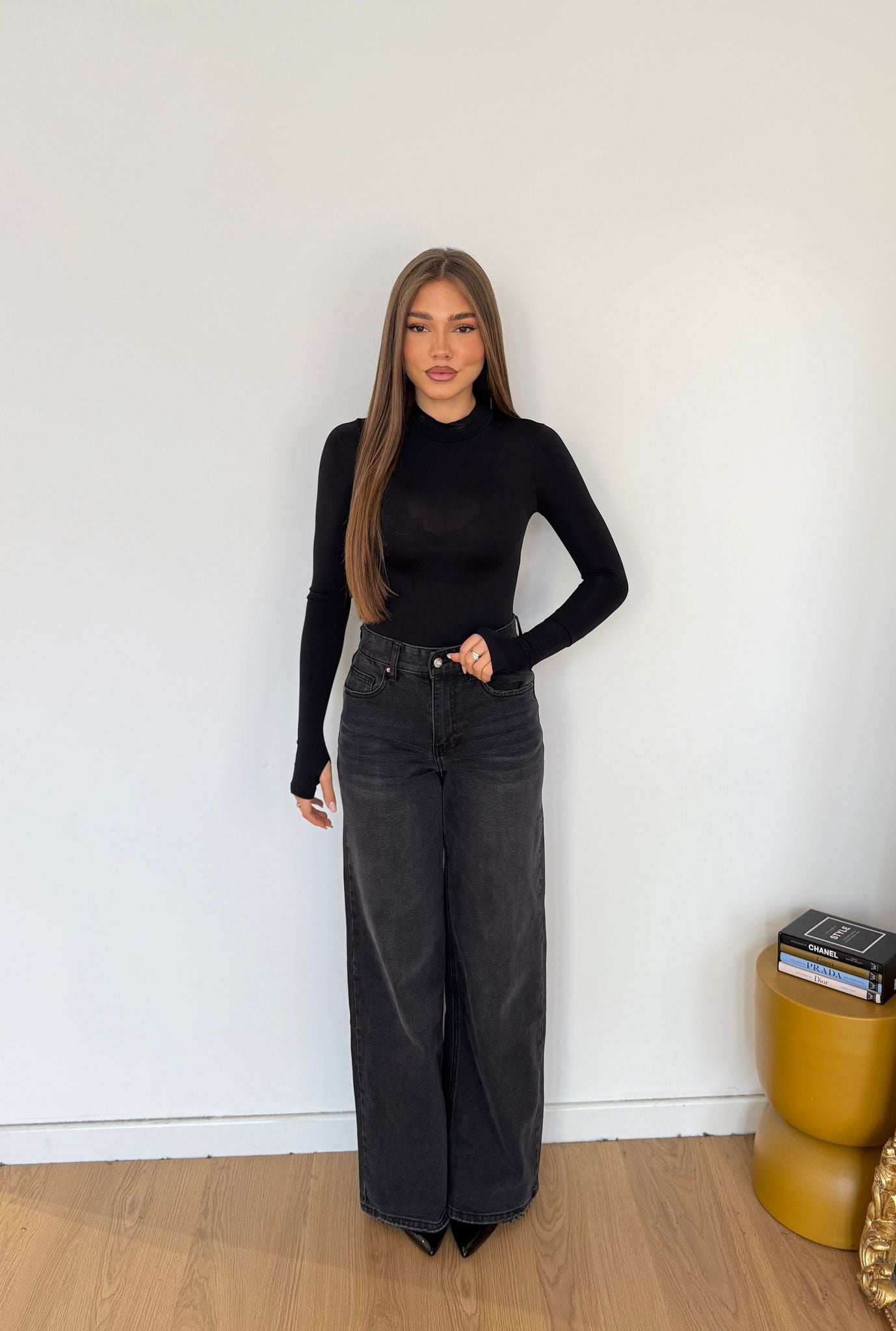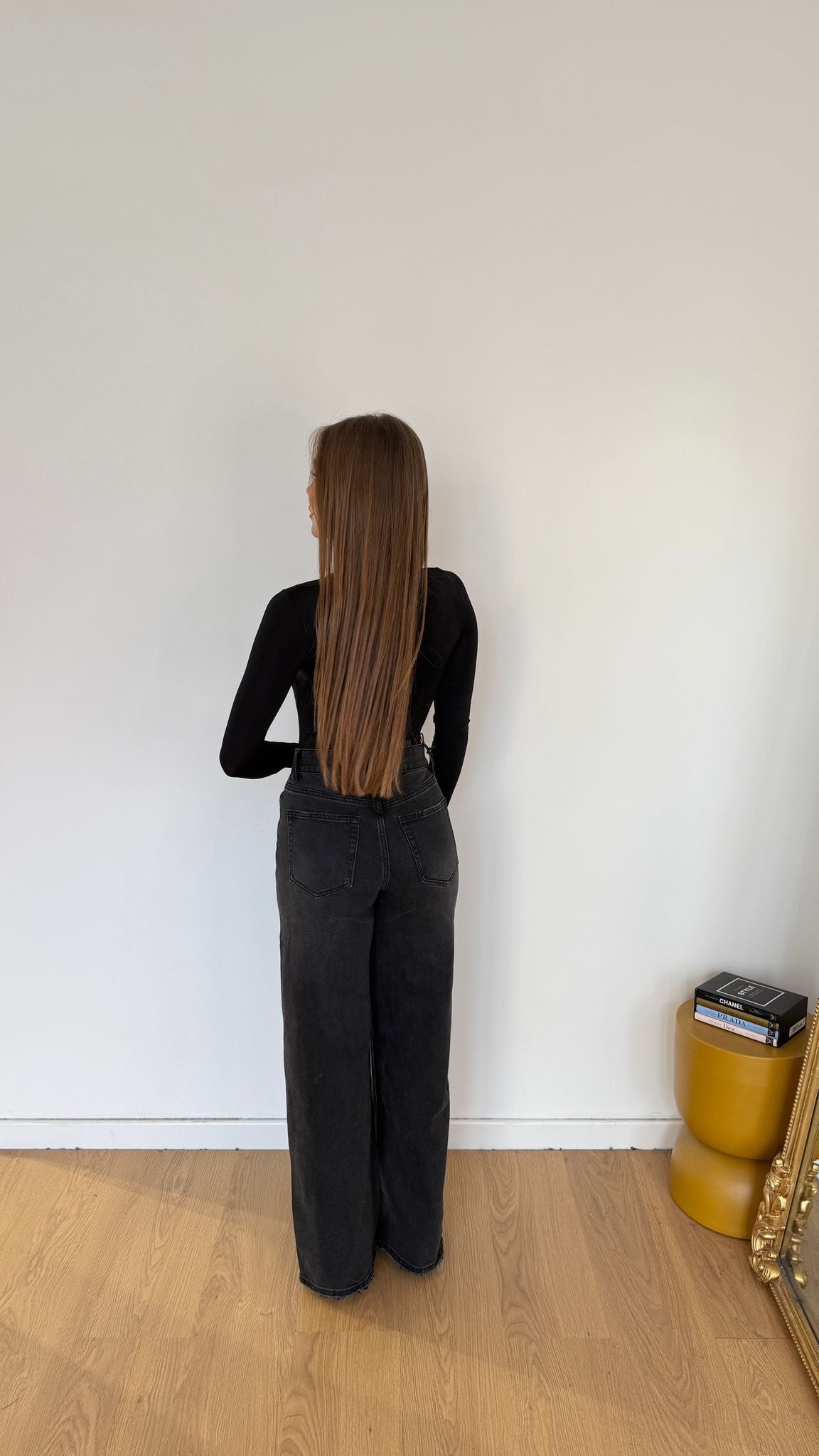 Jeans da donna in denim nero, tessuto semi elasticizzato. Veste regolarmente la propria taglia e la modella indossa taglia XS.