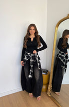 Jeans da donna in denim nero tela fissa non elasticizzato, il jeans comprende la cintura effetto camicia rimovibile e veste regolarmente la propria taglia e la modella indossa taglia S