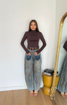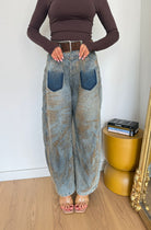 Jeans da donna modello ballon fit, tela fissa. Comprende la cintura. La modella in foto indossa taglia S.