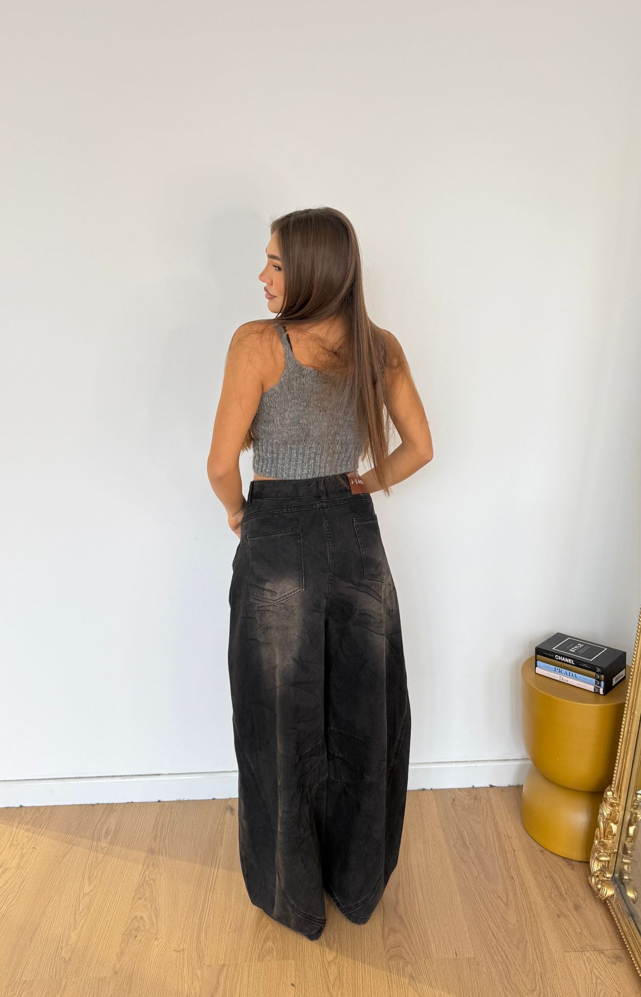 Jeans da donna modello ballon fit, tela fissa. Comprende la cintura.La modella in foto indossa taglia S.