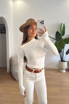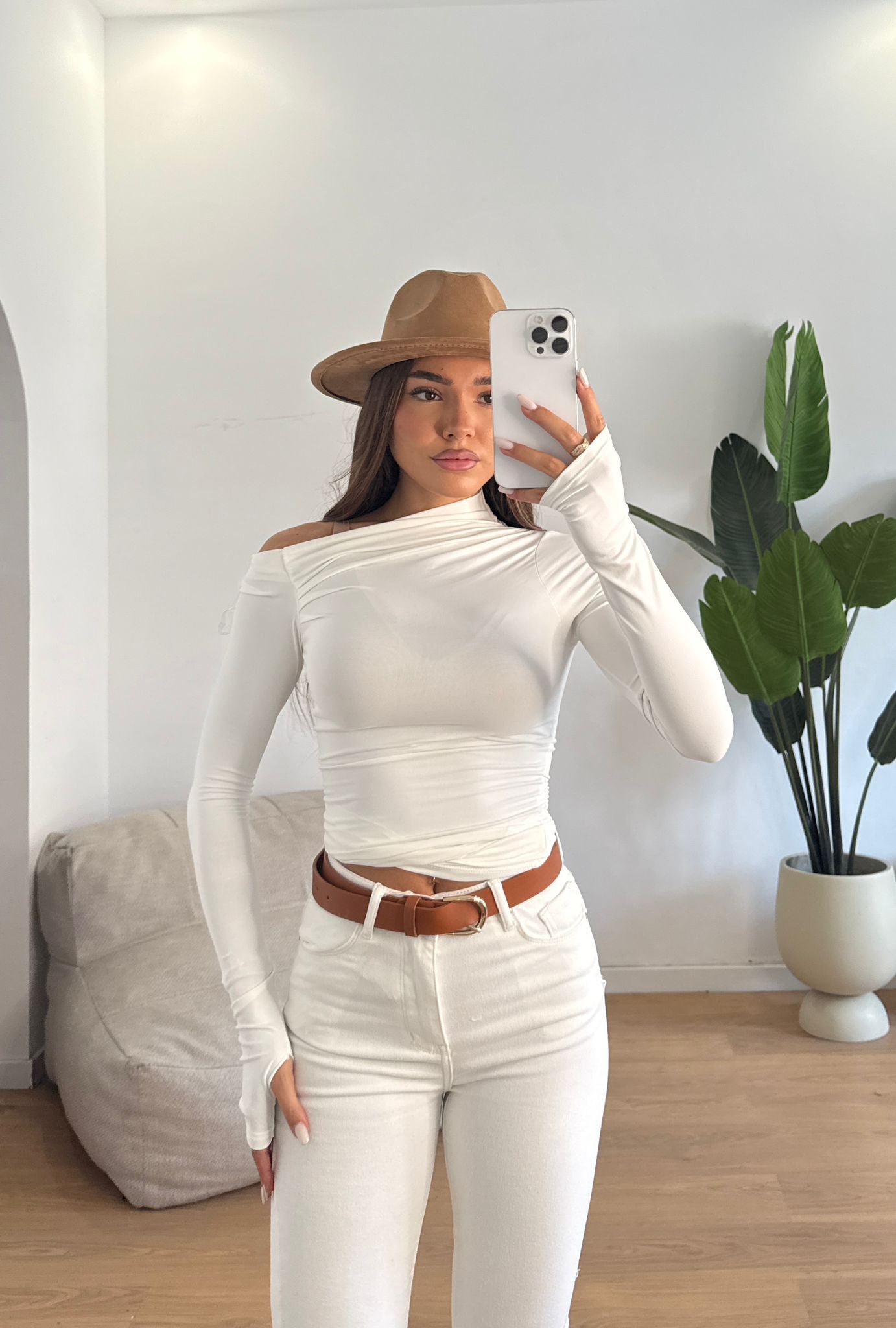 maglia da donna in licra con arricciatura sulla parte iniziale,si può' indossare anche in modo simmetrica