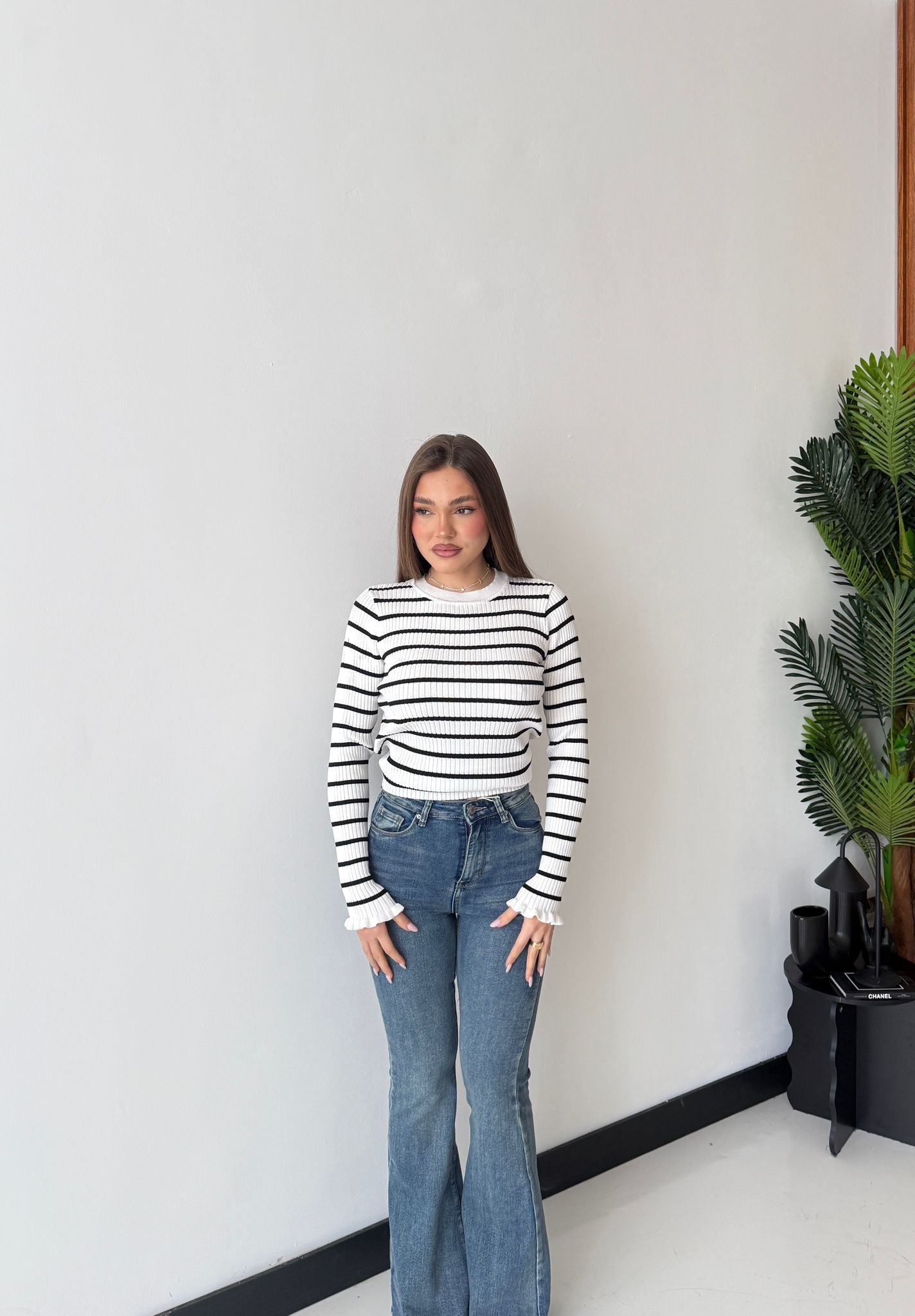 Maglioncino da donna a costine in caldo cotone, tessuto elasticizzato e veste regolarmente la propria taglia. La modella indossa una taglia S/M ed è alta 1,65cm e pesa 52/53kg