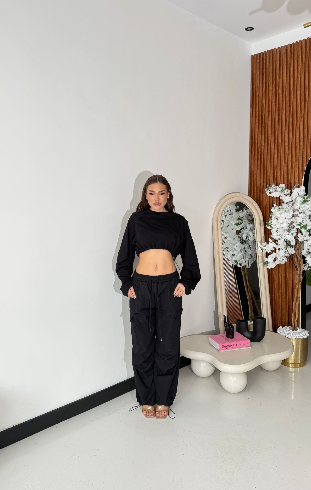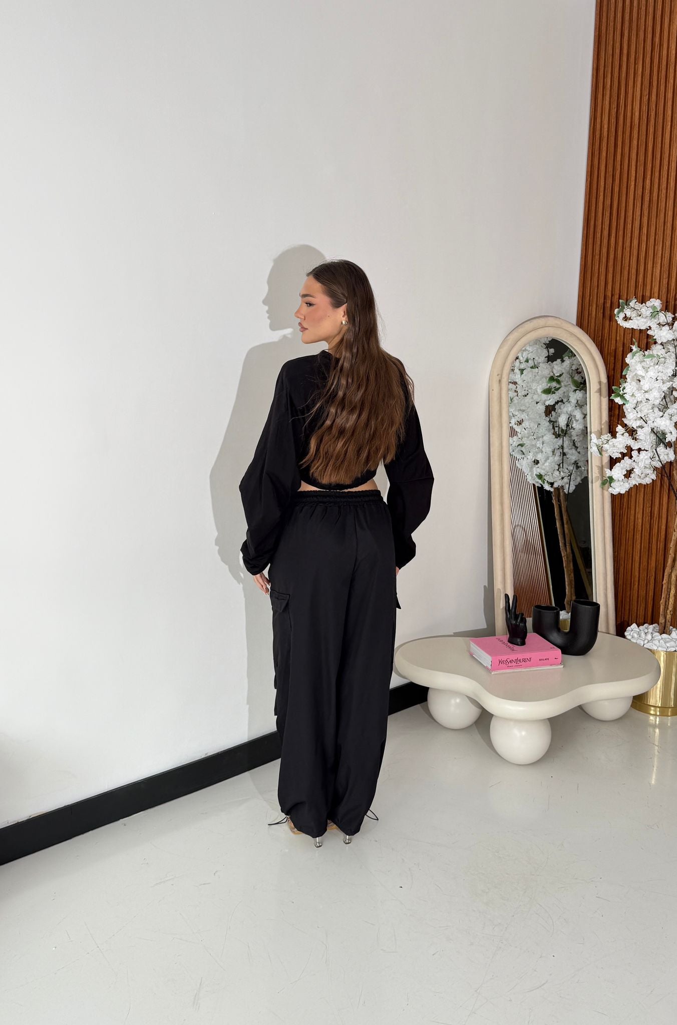 Pantalone modello cargo con elastico in vita e laccio regolabile, coulisse sul finale e vestirà bene fino ad una M/L e la modella è alta 1,65 cm e pesa 52/53 kg