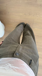 Pantalone da donna tessuto effetto camoscio,con elastico in vita sul retro e bottoncino sul davanti, semi elasticizzato, top quality. La modella indossa taglia S.
