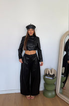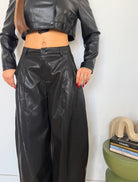 pantalone da donna in ecopelle a gamba larga e veste la propria taglia e la modella indossa taglia S