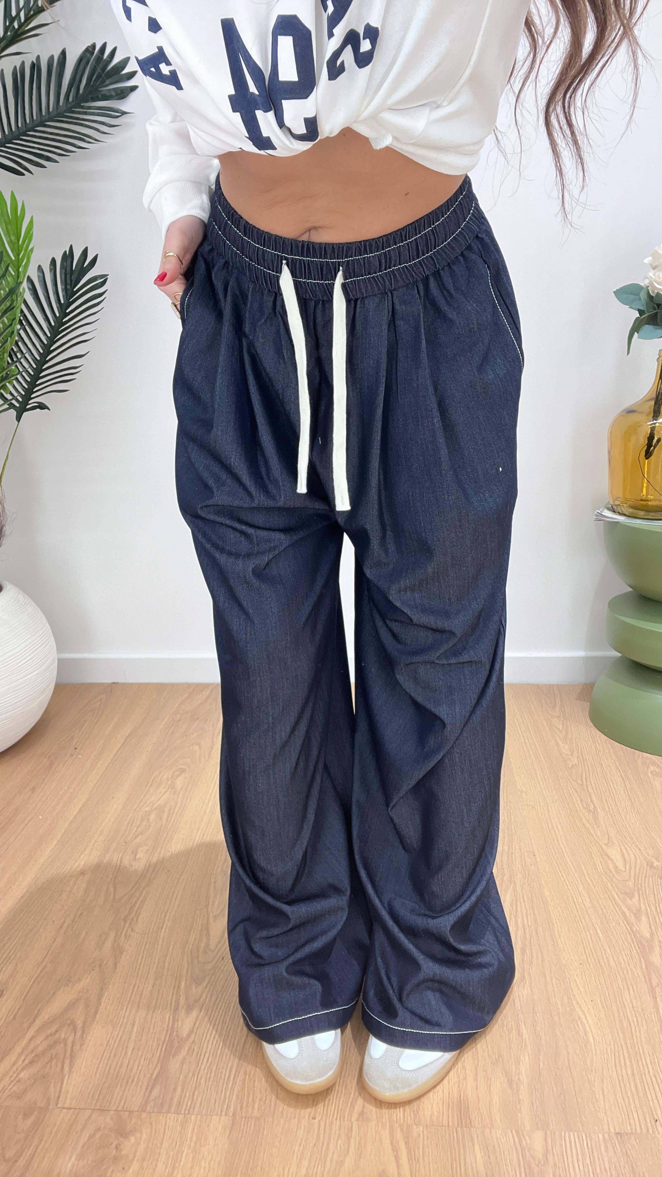 Pantalone da donna a palazzo morbido con elastico in vita e laccio regolabile, veste regolarmente la propria taglia e Giusy indossa taglia S/M