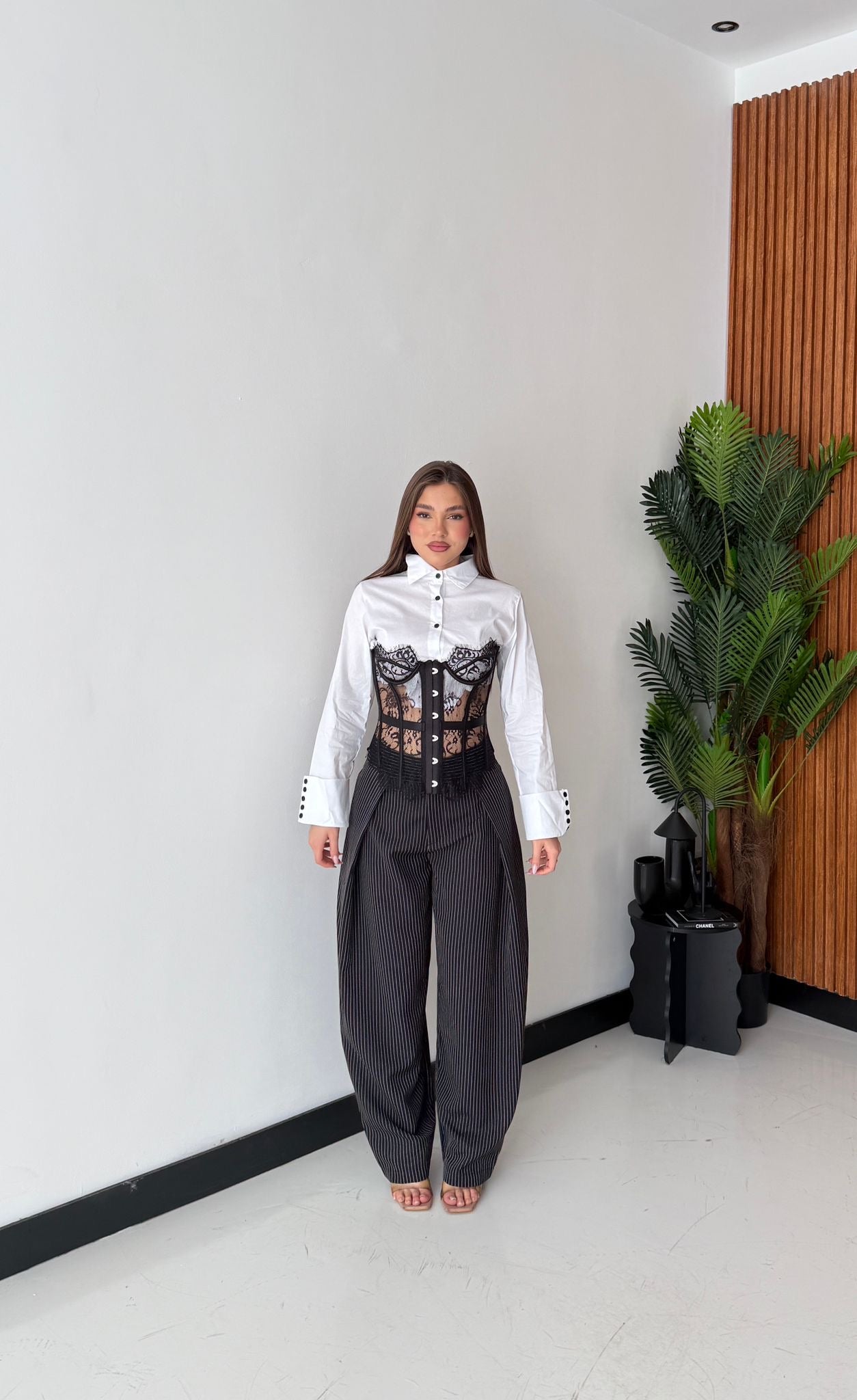 Pantalone in cotone, vita alta, gamba larga, con tasche laterali e chiusura a gancetto sul davanti. Veste regolarmente la propria taglia, la modella in foto indossa taglia S ed è alta 1,65 e pesa 52/53kg.