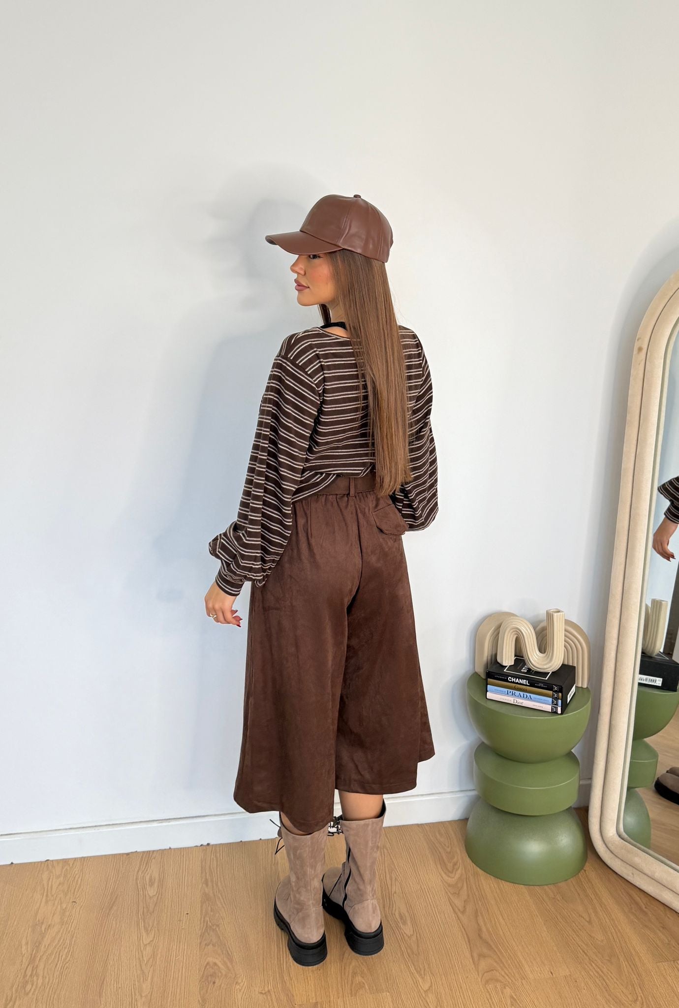 Pantalone da donna tessuto camoscio con cintura compresa e veste bene la propria taglia, la modella indossa taglia S