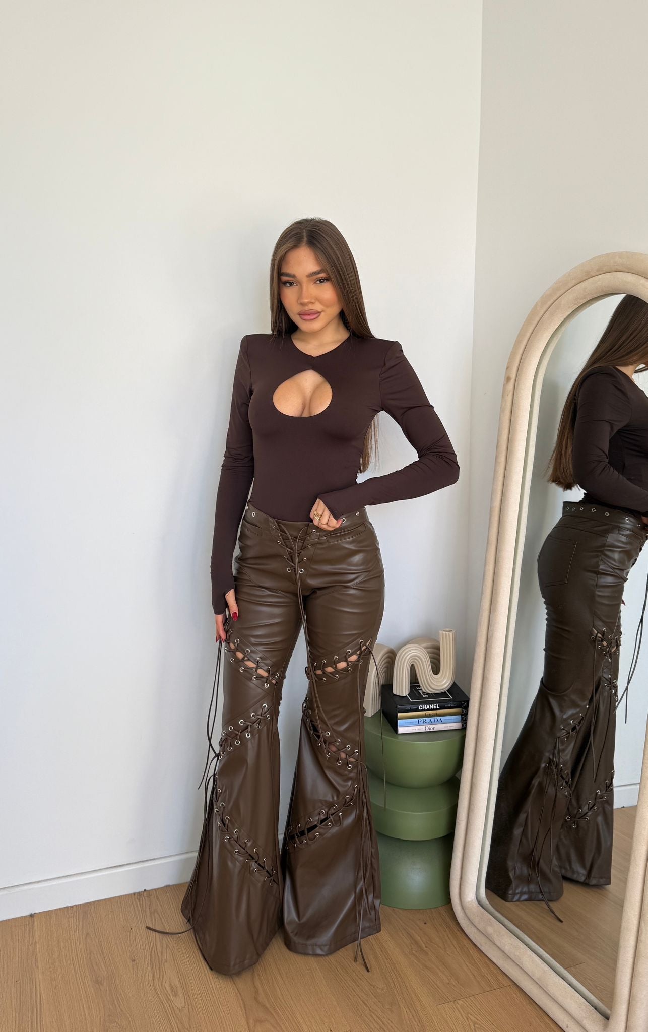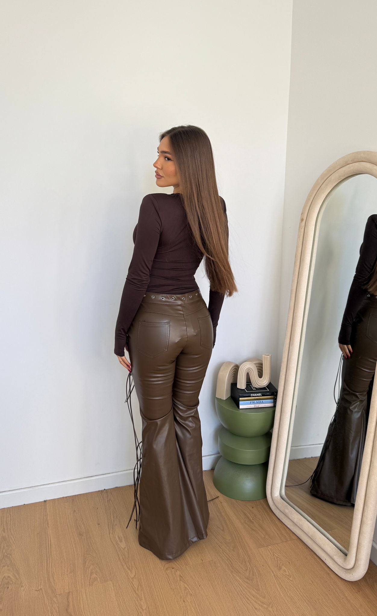 Pantalone in ecopelle da donna a zampa, top quality e veste regolarmente la propria taglia e la modella indossa taglia S