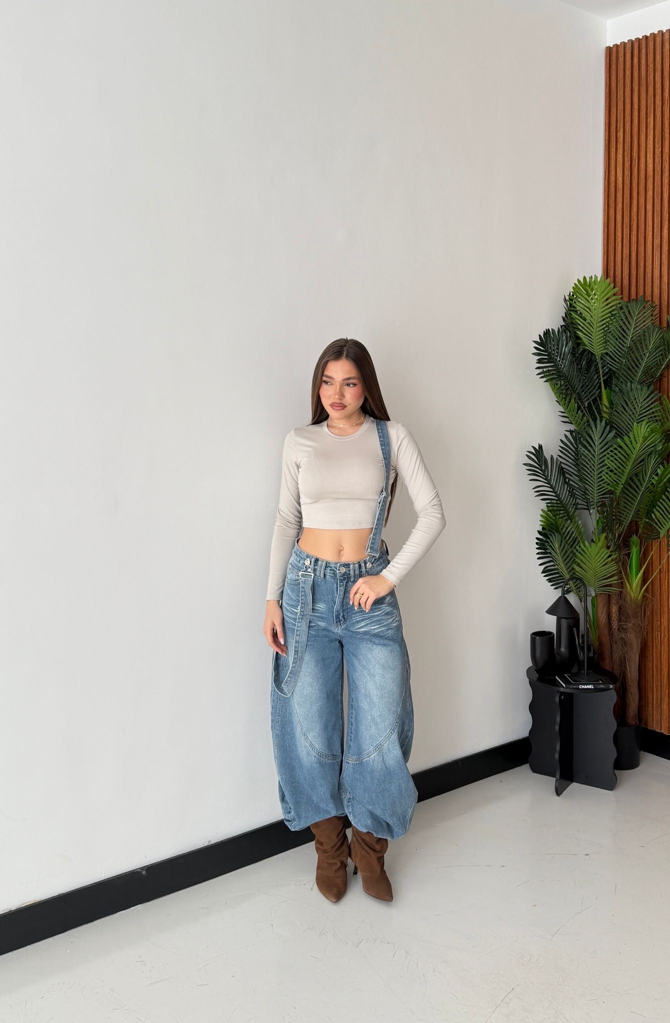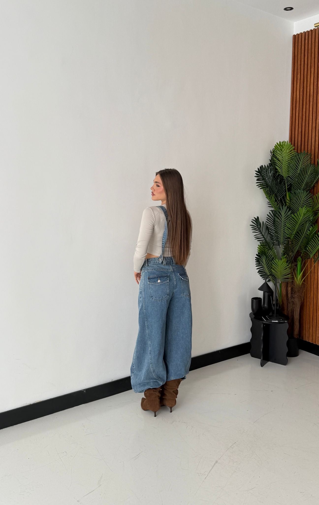 Salopette in denim in tela fissa modello ballon-fit e veste bene la propria taglia e la modella indossa taglia S ed è alta 1,65 cm e pesa 52/53 kg