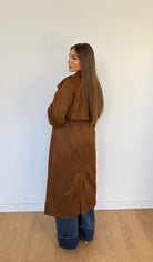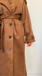 Trench da donna in camoscio, foderato internamente. Chiusura a bottoni e cintura in vita. La modella in foto indossa taglia S/M.