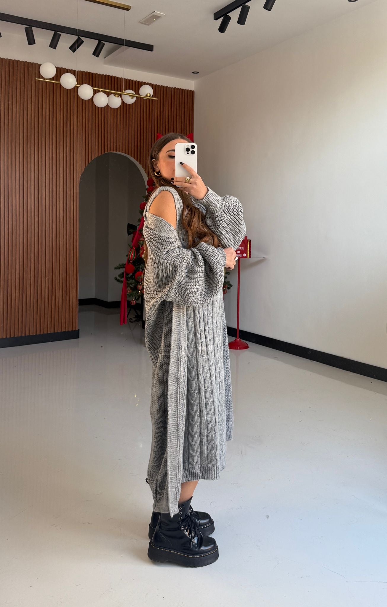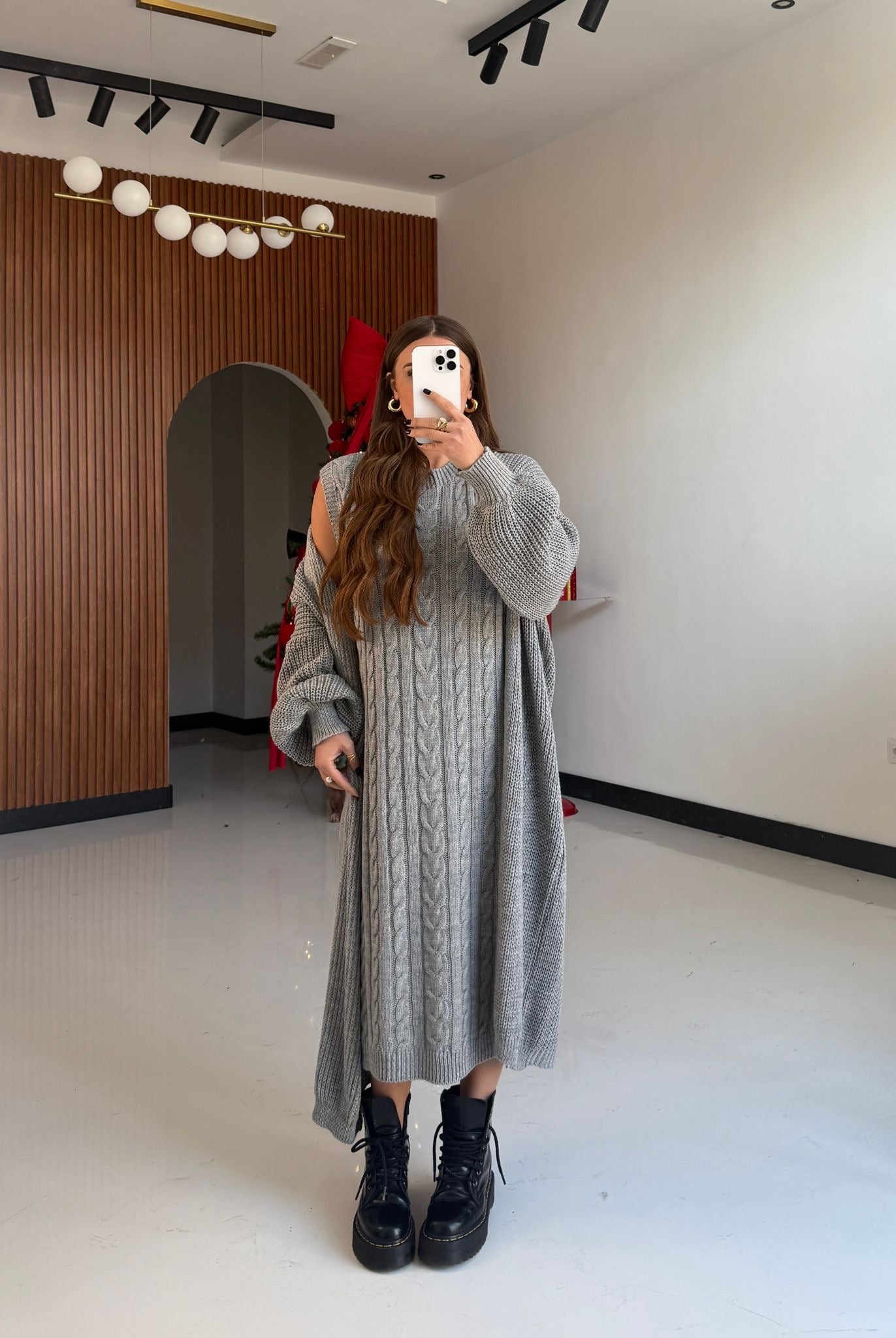 Coord.set da donna in lana rasata composto da abito a giro maniche e cardigan con polsini e maniche a sbuffo, tessuto elasticizzato e vestirà bene fino ad una M/L piena