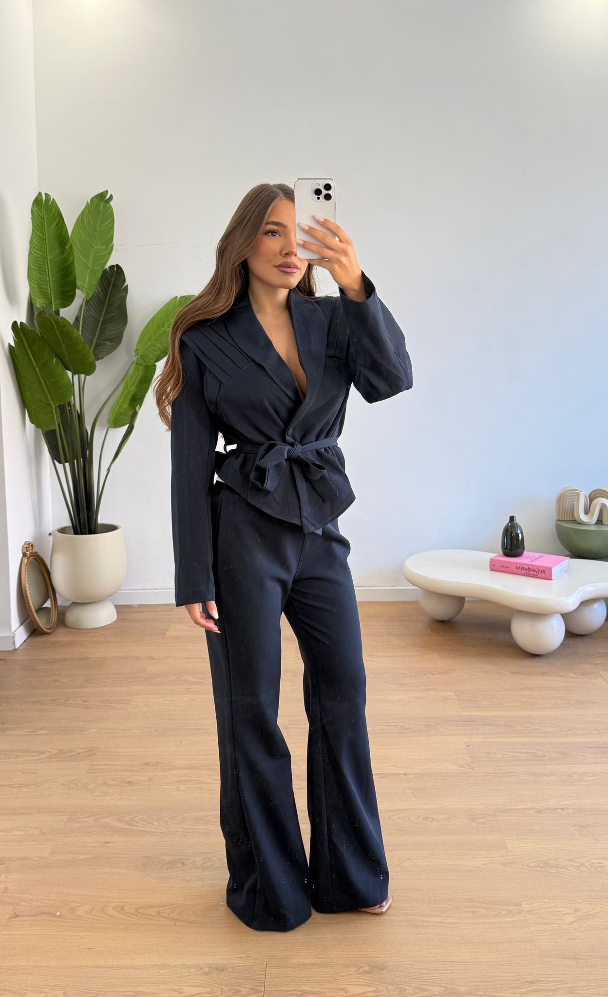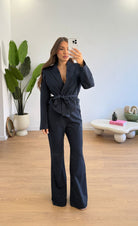 Coordinato da donna composto da giacca con chiusura a bottone e cintura in vita, e pantalone con elastico in vita sul retro. Taglia unica, veste bene fino ad una M.