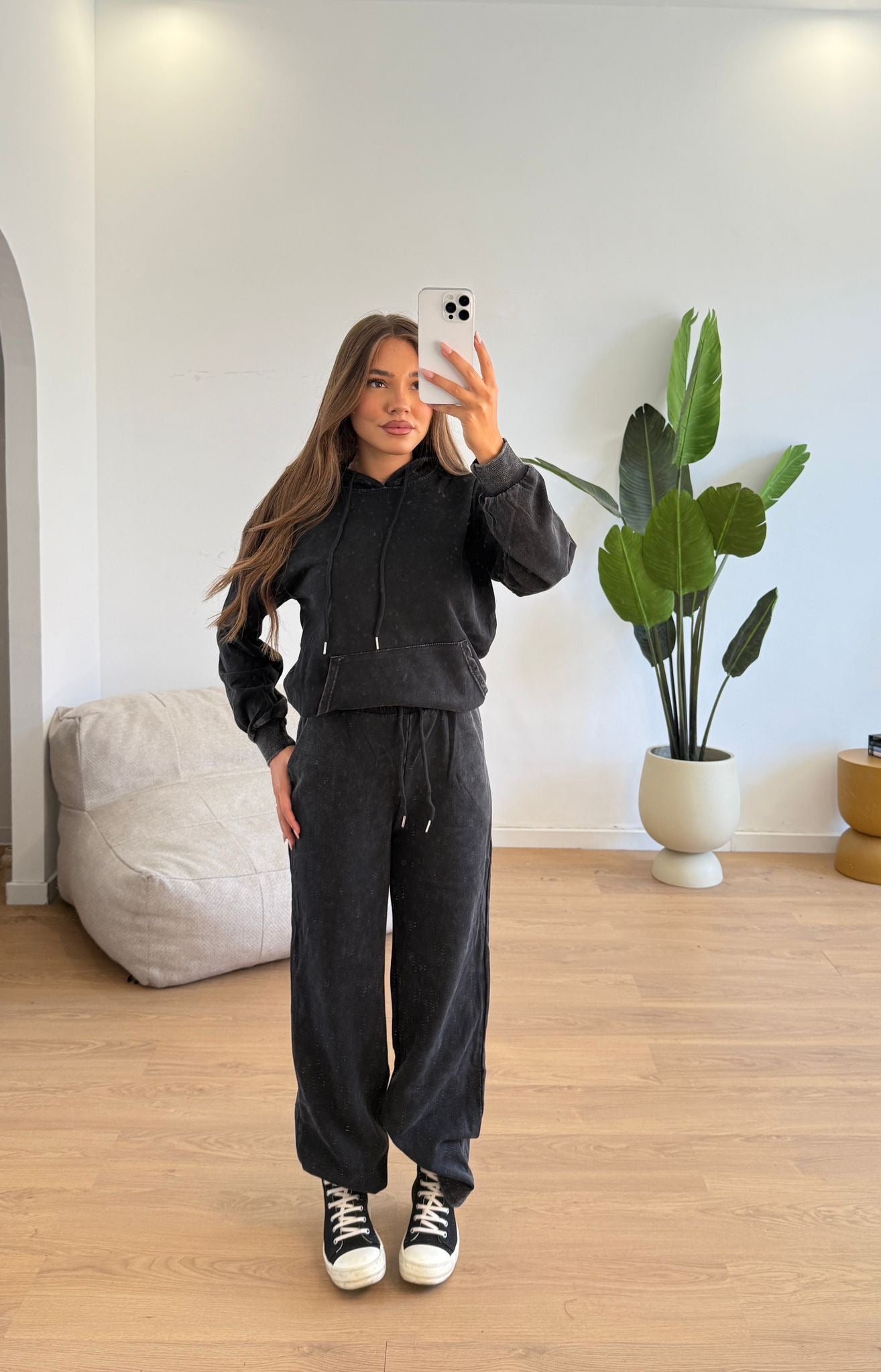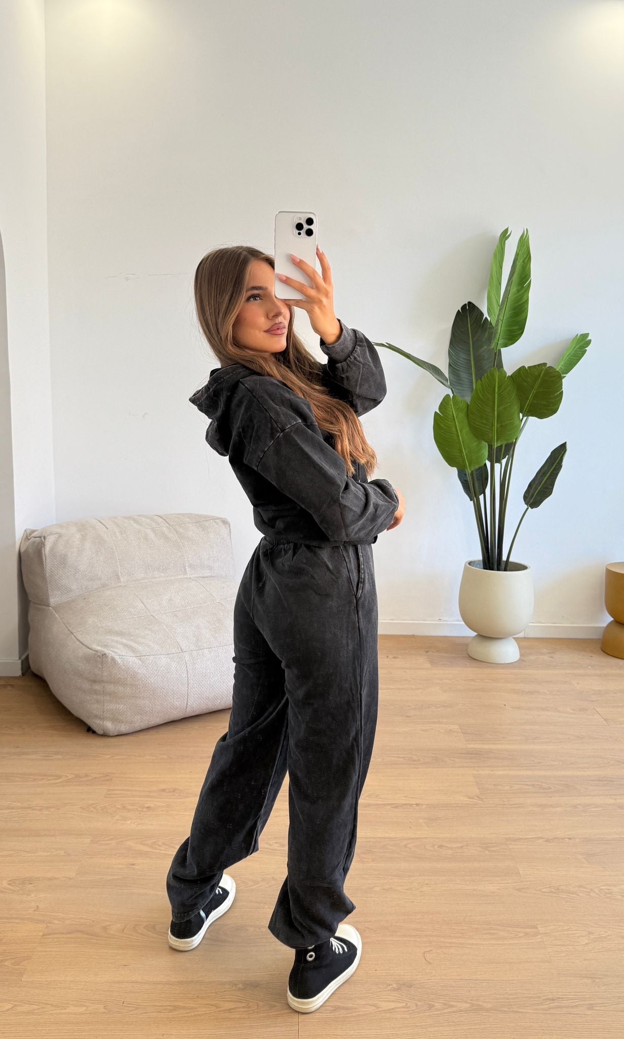 Coordinati da donna in tuta modello oversize composto da felpa con cappuccio e zip sul davanti e pantalone con elastico in vita, la modella in foto indossa taglia S/M
