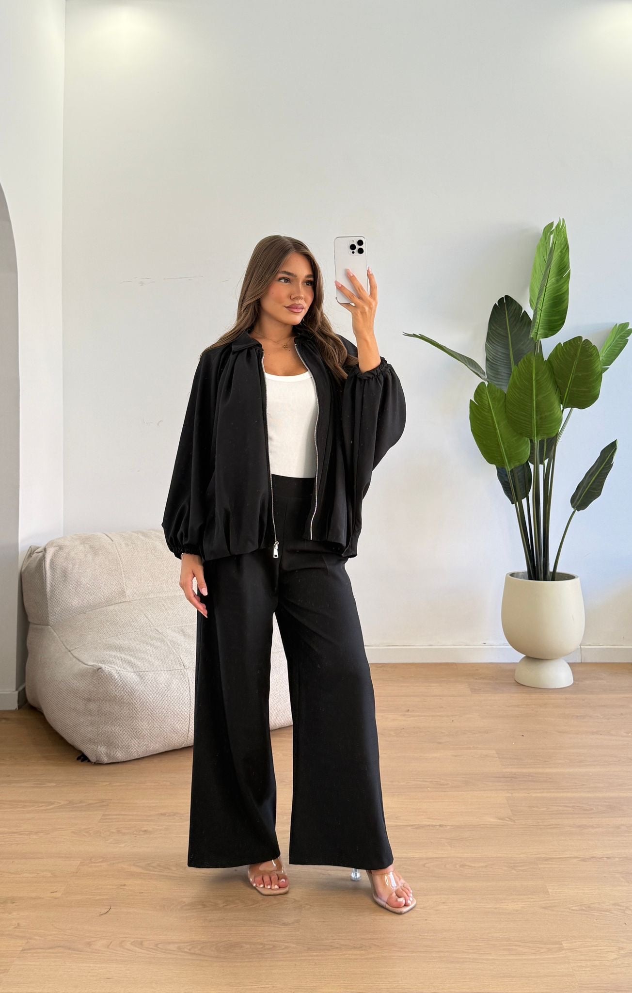 Coordinato da donna in cotone leggero composto da blusa con manica a palloncino e chiusura zip sul davanti e pantalone con elastico sul retro in vita e vestita bene fino ad una M/L