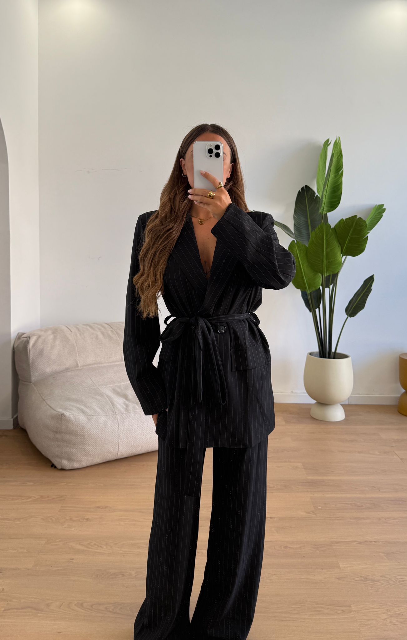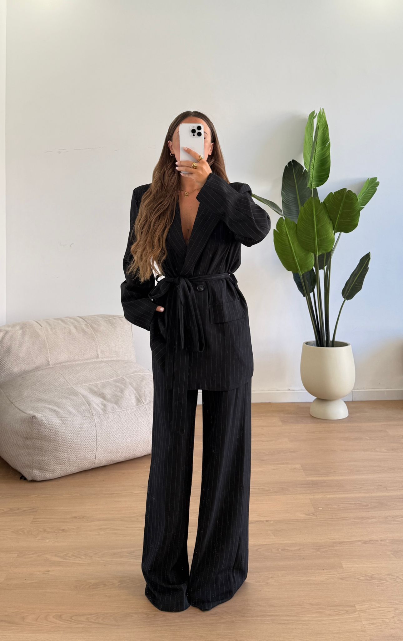 Coordinati da donna composto da giacca con spalline imbottite e cintura e pantalone con elastico in Vita sul retro, vestita bene fino ad una M/L