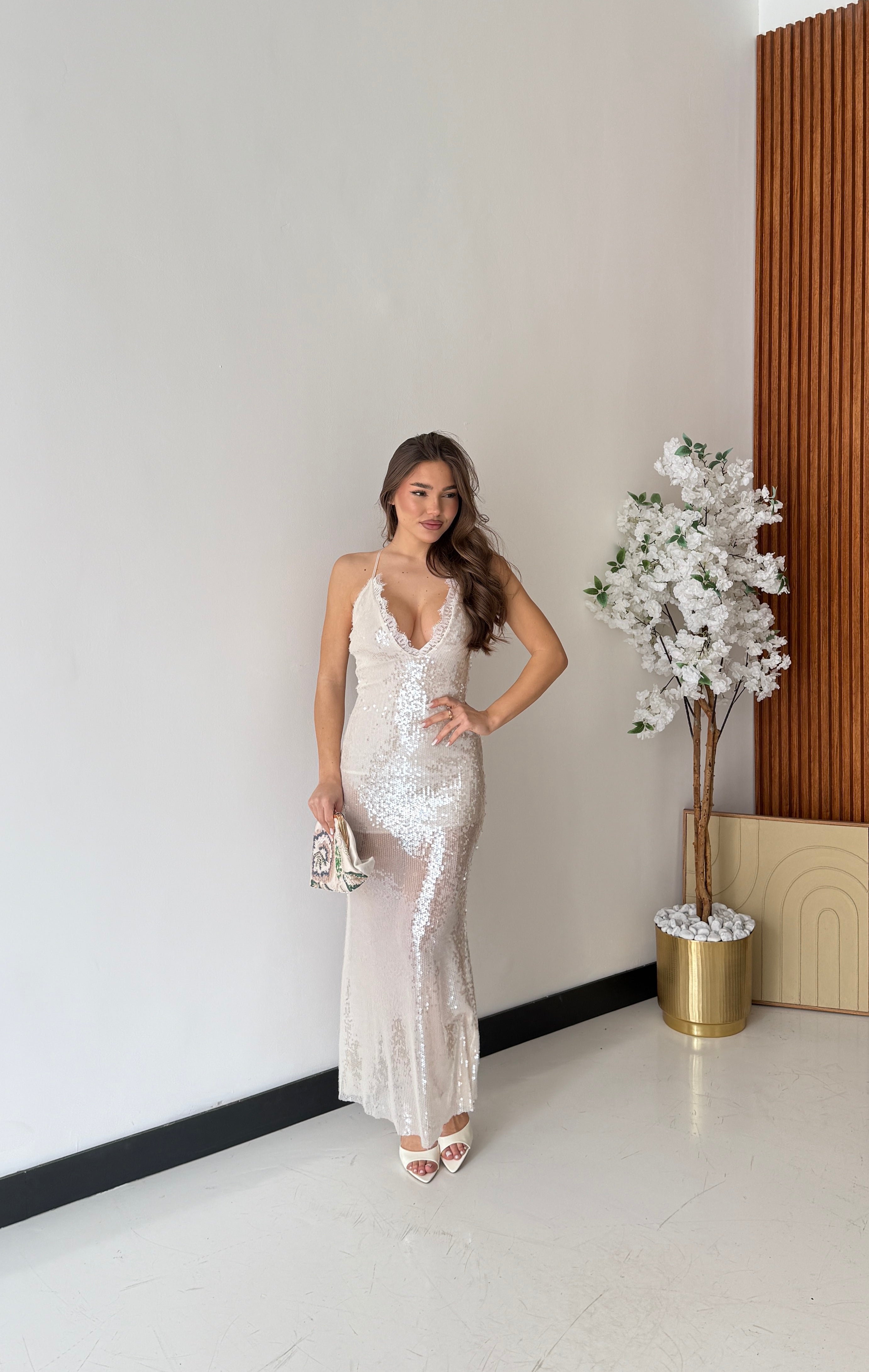 Abito in paillettes, foderato internamente, con scollo profondo, con dettaglio in pizzo sul davanti e bretelle regolabili ad intreccio sul retro. Taglia unica, tessuto elasticizzato, veste bene fino ad una taglia M piena. La modella è alta 1,65 e pesa 52/53kg.