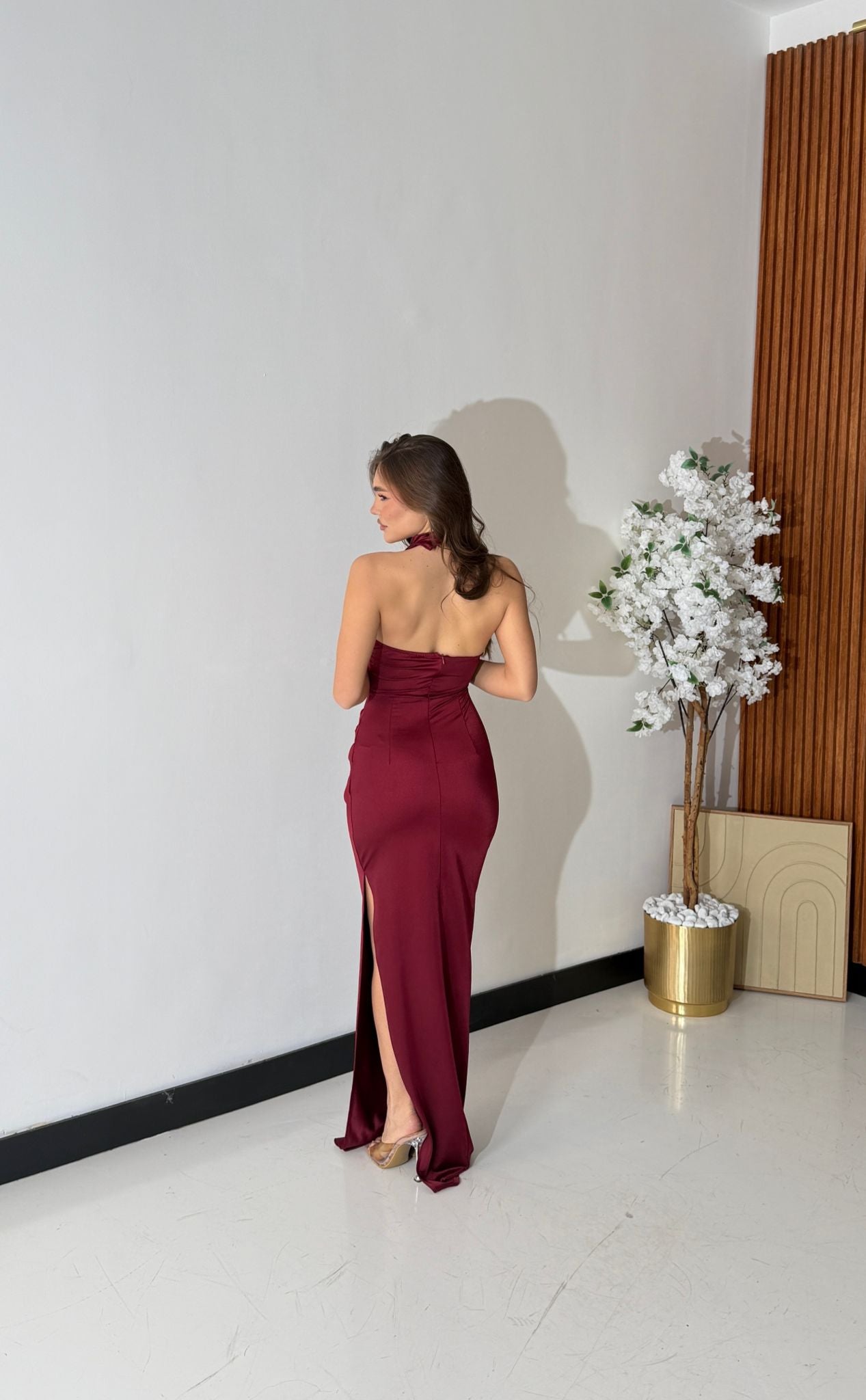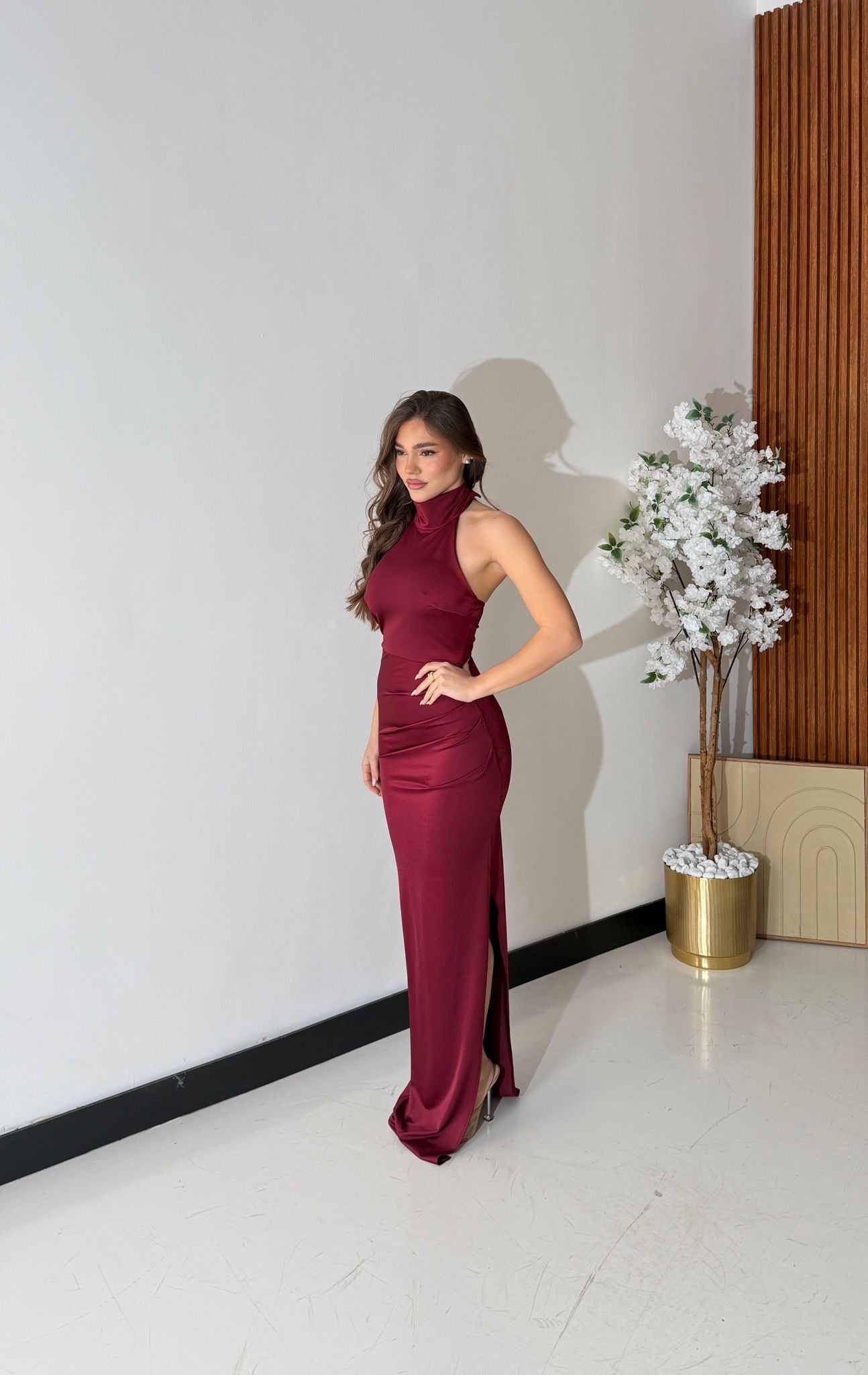 Abito in lycra, effetto satin con colletto, drappeggio e spacco laterale, elastico e chiusura a zip sul retro.Taglia unica, tessuto elasticizzato, veste bene fino ad una taglia M piena. La modella è alta 1,65 e pesa 52/53 Kg.