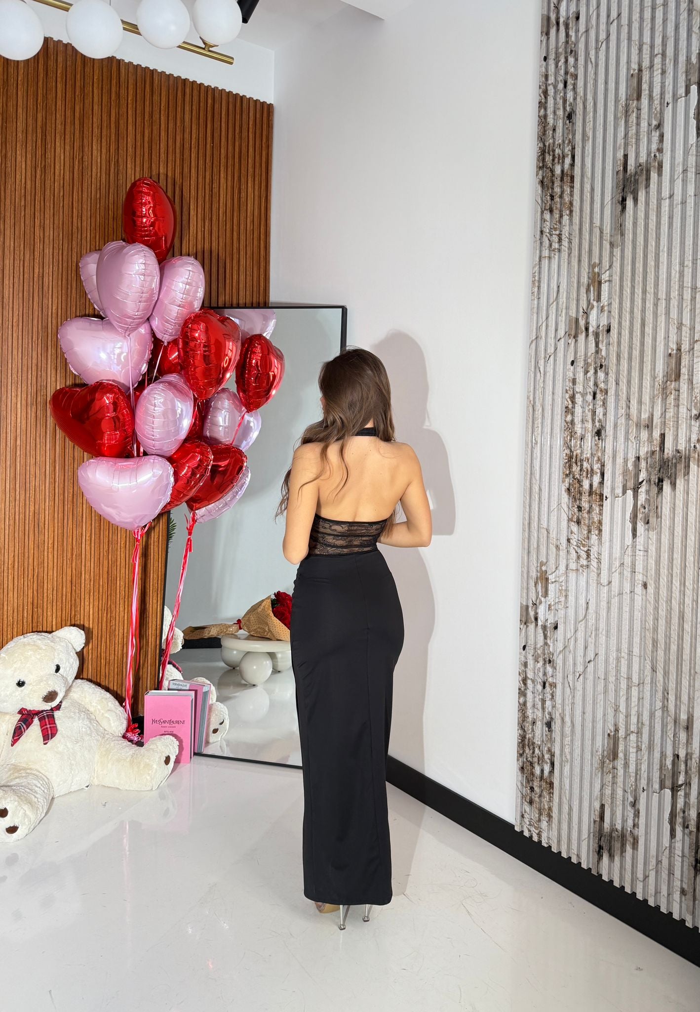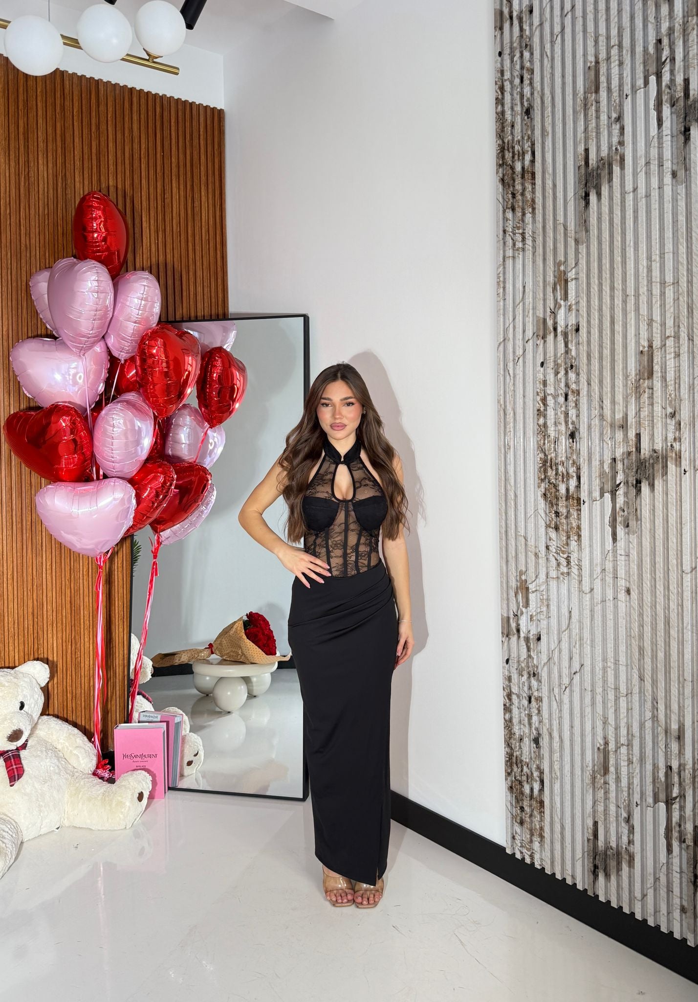 Abito da donna con coppe imbottite, parte superiore in pizzo con colletto, parte inferiore in lycra, tessuto elasticizzato. Taglia unica, veste bene fino ad una taglia M piena. La modella è alta 1,65 e pesa 52/53kg.